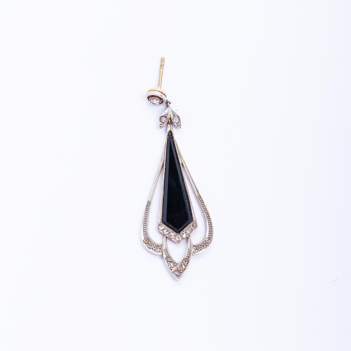 Caravana art nouveau en oro blanco y amarillo con varios pequeños diamantes y sección central en ónix. Alto 47 mm. Peso bruto 3,3 gr.