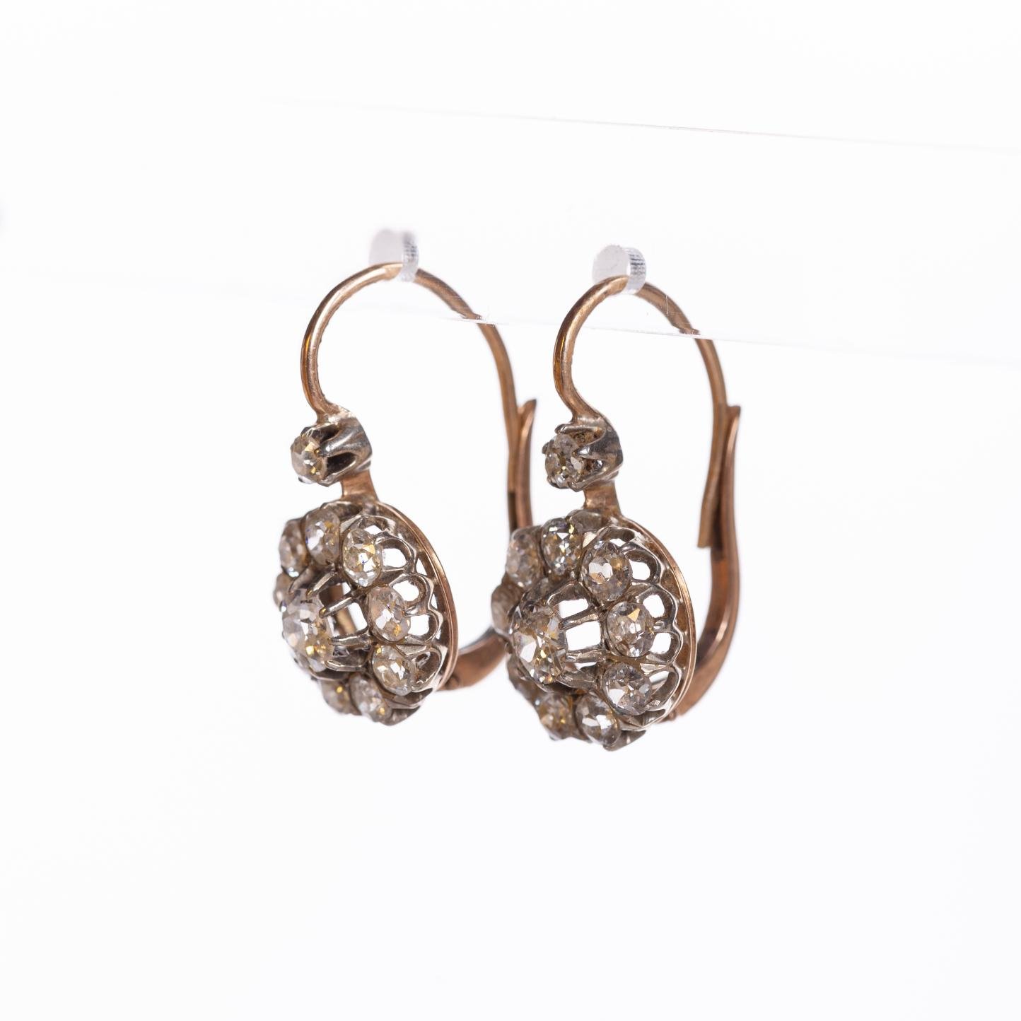 Par de caravanas tipo roseta en oro 18 K blanco y amarillo decoradas, en cada una, con un diamante central talla brillante de 0,25 ct aprox. rodeado por nueve diamantes talla brillante de 0,08 ct aprox., cada uno, y uno de 0,06 ct aprox. Diámetro 11 mm. Peso total bruto 3,4 gr.