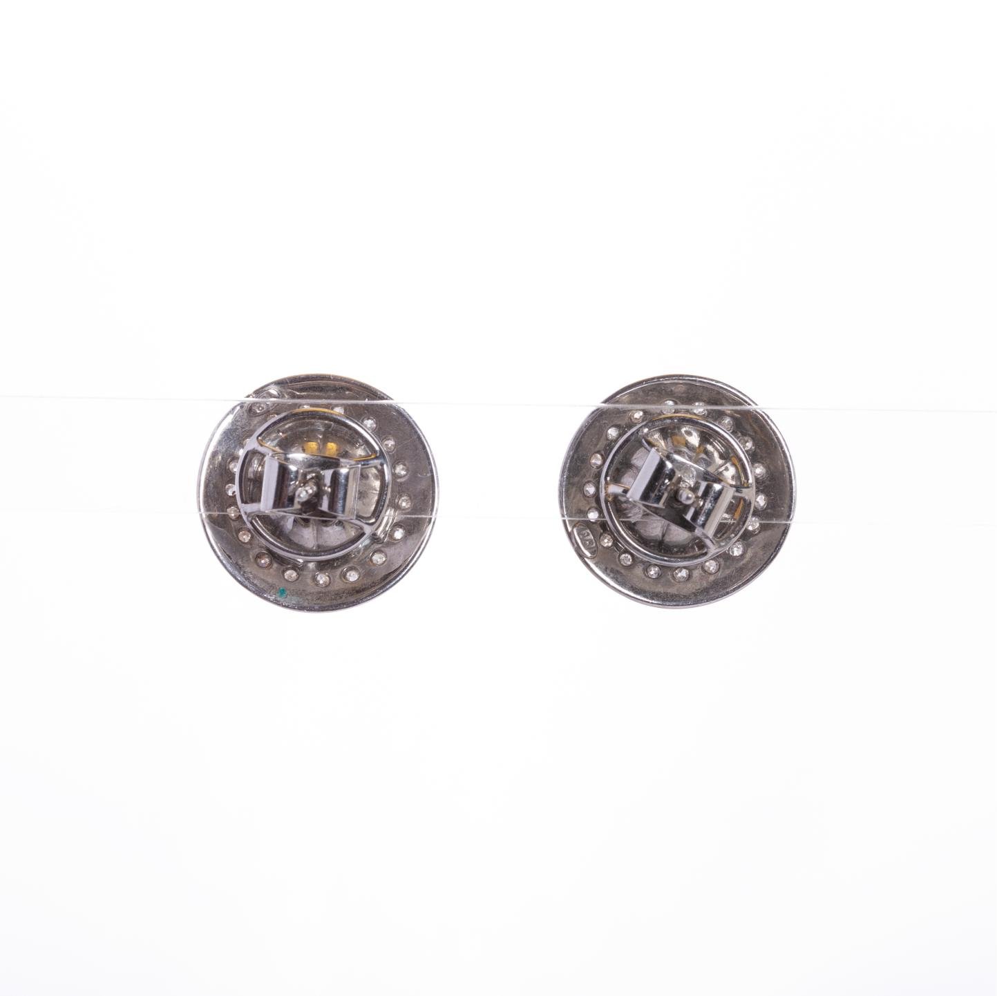 Par de caravanas tipo tornillo en oro 18 K blanco con media perla central de un diámetro de 12,5 mm y diecinueve pequeños diamantes talla brillante en cada una. Diámetro 20 mm. Peso 12,5 gr.
