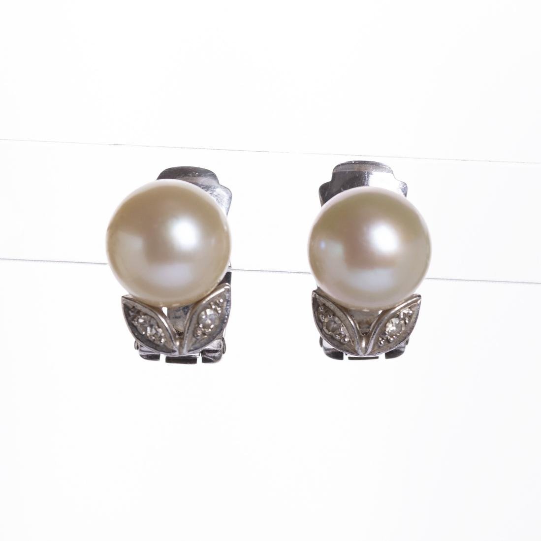 Par de caravanas tipo clip en oro 18 K blanco con una perla central de cultivo en cada una, de un diámetro de 9,5 mm, y dos pequeños diamantes talla brillante en cada una. Alto 13 mm. Peso bruto 8,5 gr.
