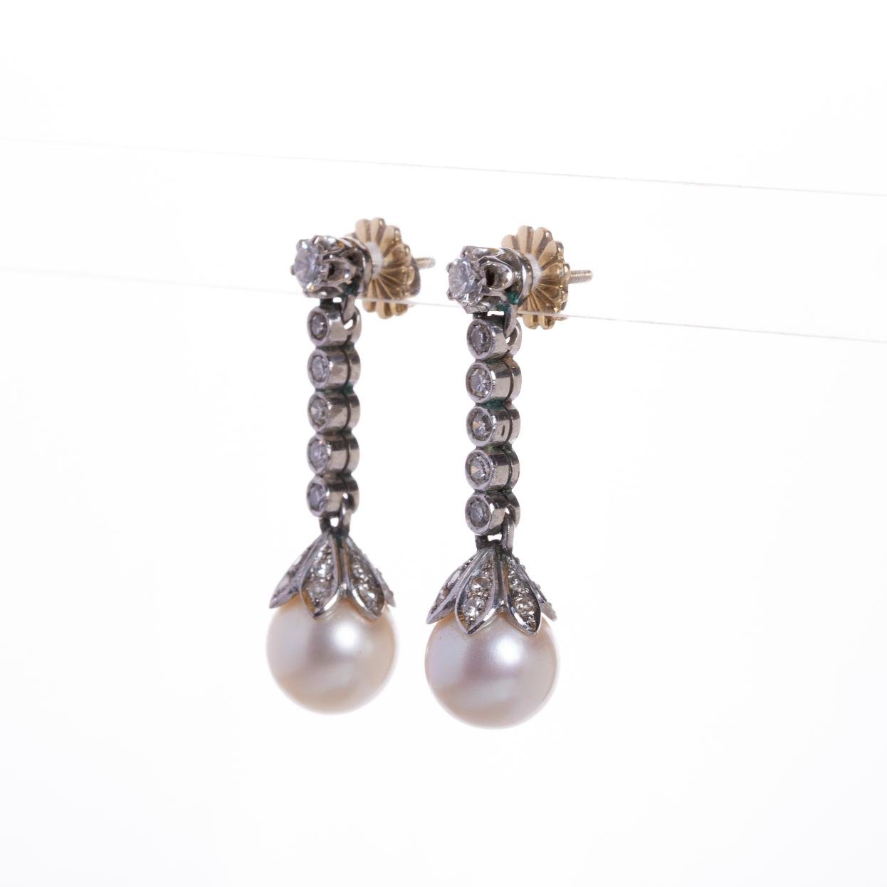Par de caravanas en oro 18 K decoradas, cada una, con una perla de cultivo móvil de un diámetro de 9,5 mm y dieciocho diamantes talla brillante (los dos mayores de 0,20 ct aprox.). Alto 33 mm. Peso total bruto 8 gr.