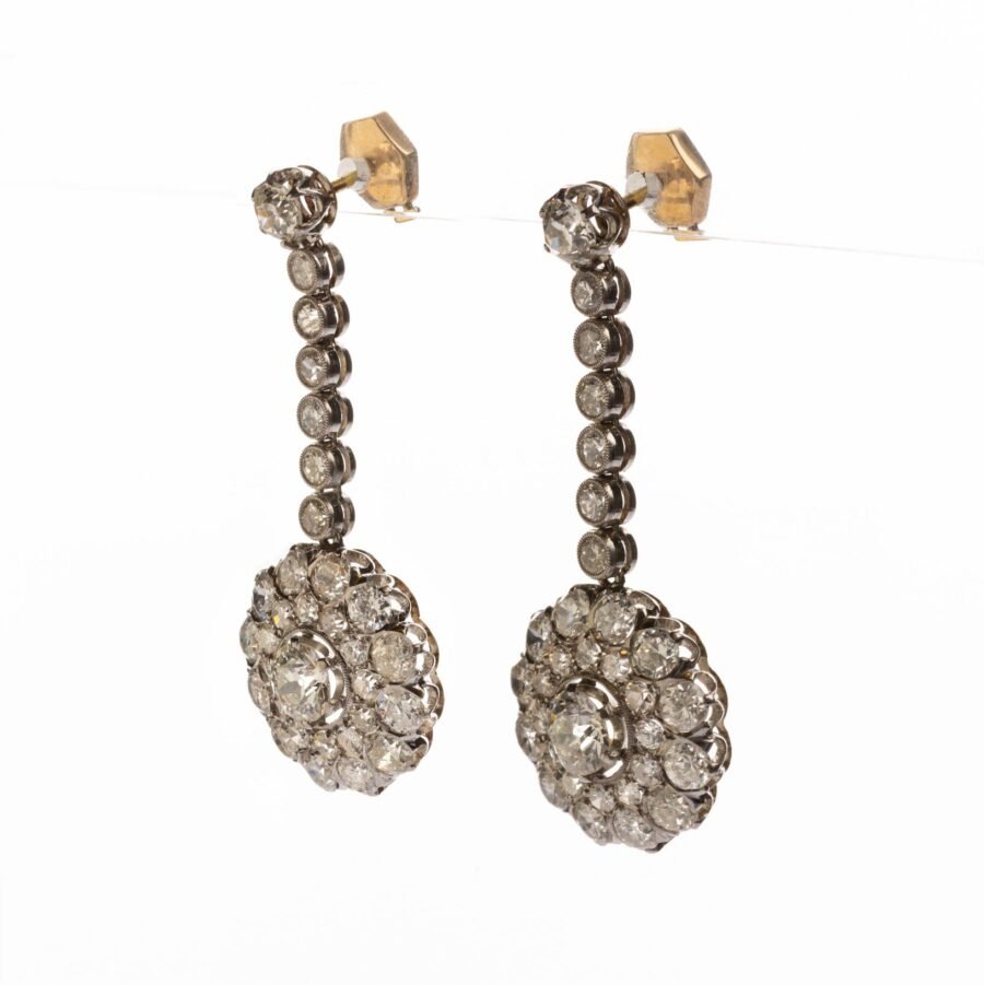 Par de caravanas móviles en oro 18 K blanco y amarillo esculturadas en forma de flor con un diamante central talla brillante de 0,75 ct aprox. en cada una, rodeados por treinta y un diamantes talla brillante en cada uno, en diferentes tamaños. Alto 46 mm. Diámetro de roseta 28 mm. Peso bruto 11,8 gr.