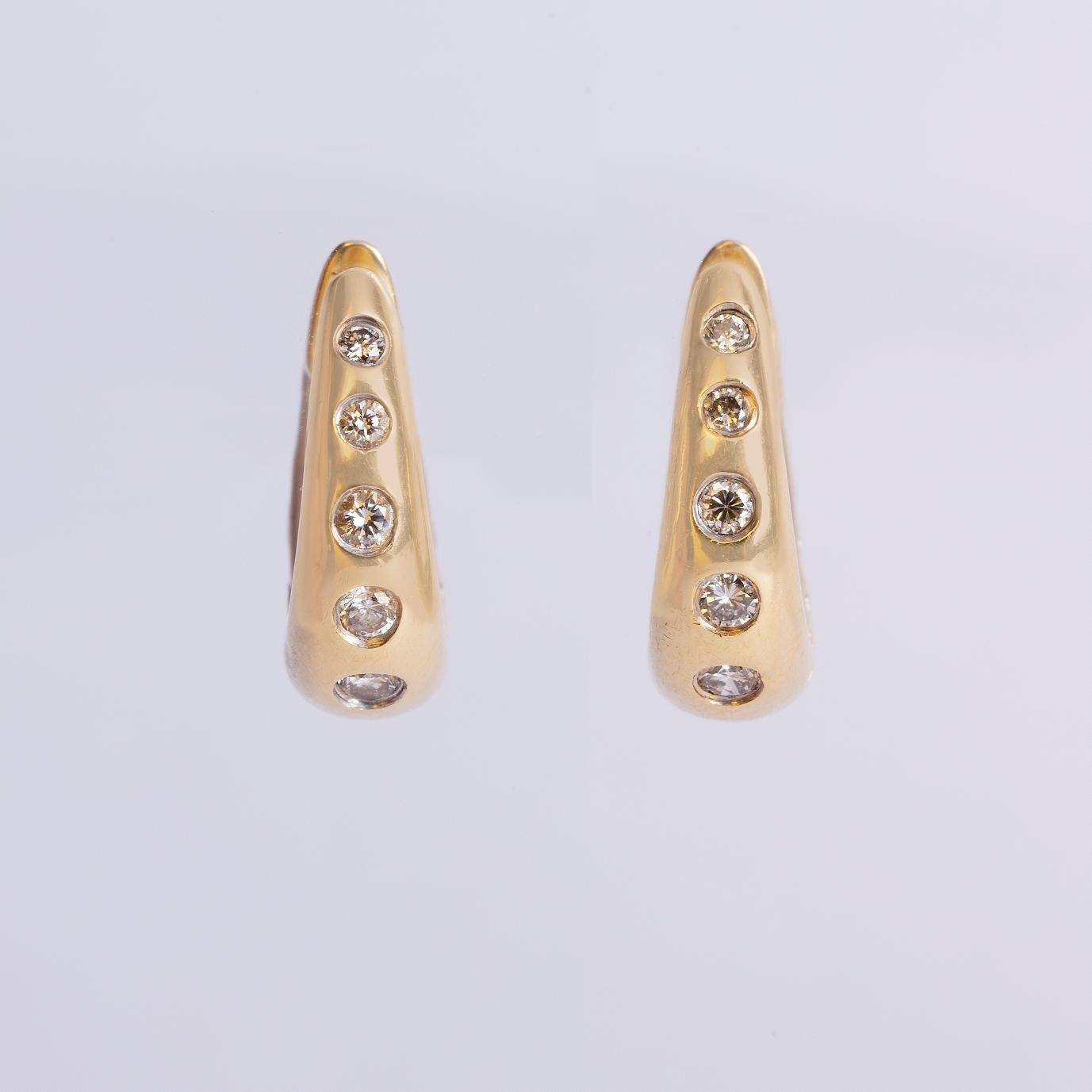 Par de caravanas en oro 18 K amarillo y blanco con cinco pequeños diamantes talla brillante en cada una. Peso 6 gr.