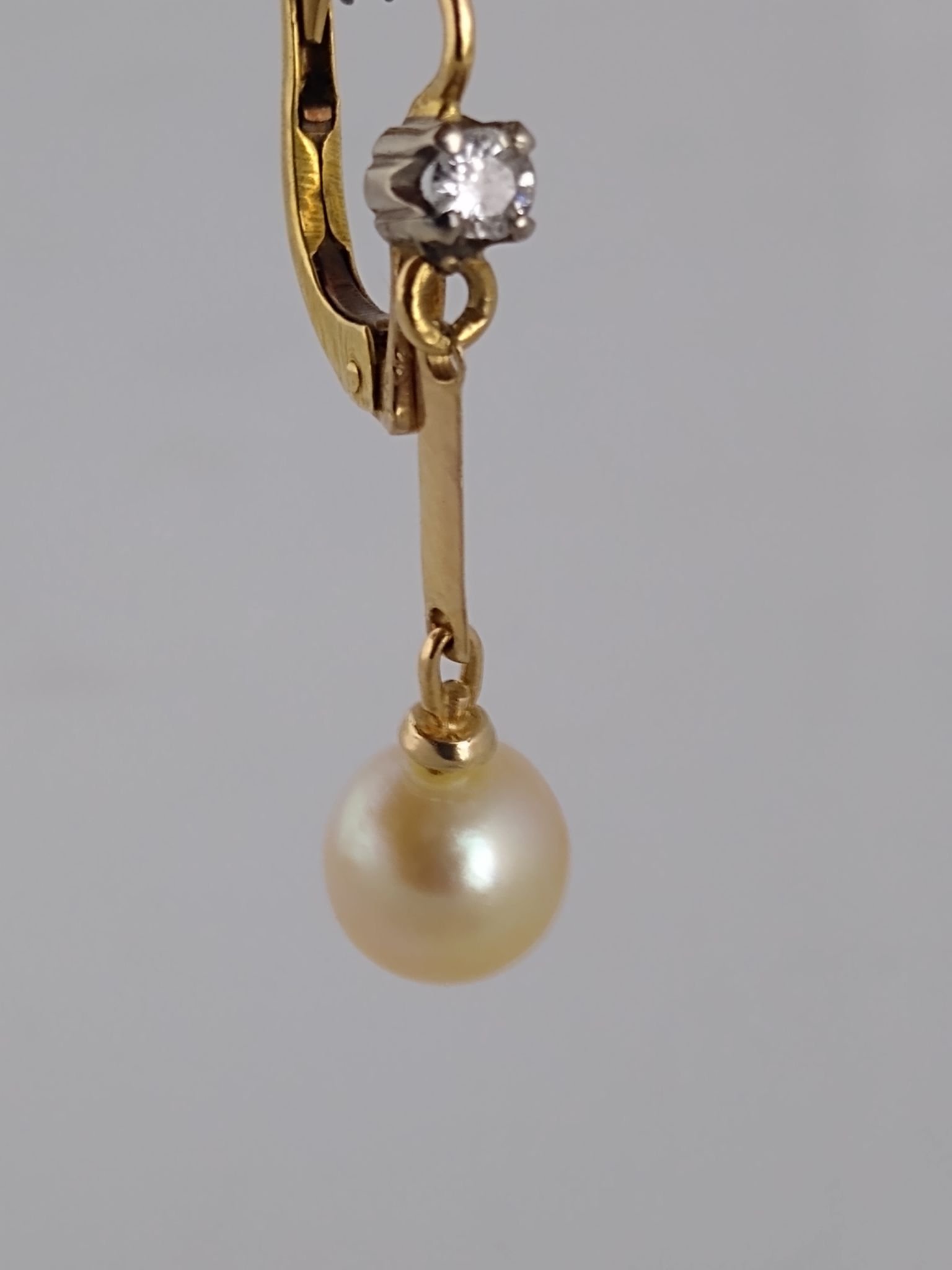 Par de caravanas en oro 18 K amarillo con un pequeño brillante cada una y una perla de un diámetro de 6.5 mm cada una. Peso bruto 3 gr.
