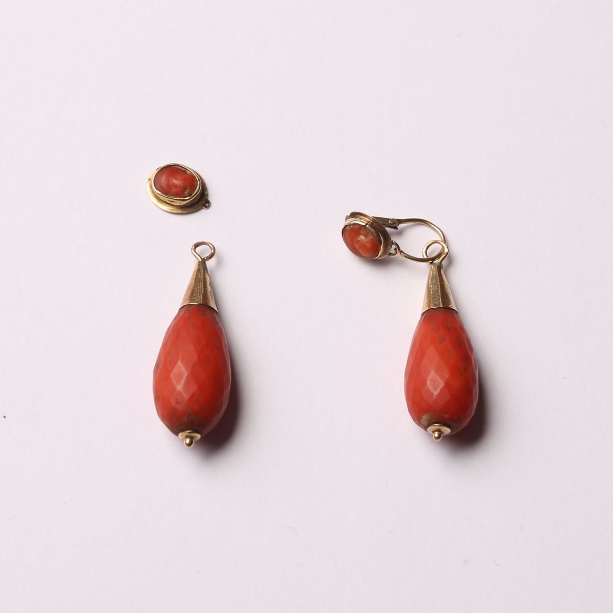 Par de caravanas en oro amarillo con colgante tipo gota en coral. Falta cierre en una caravana.