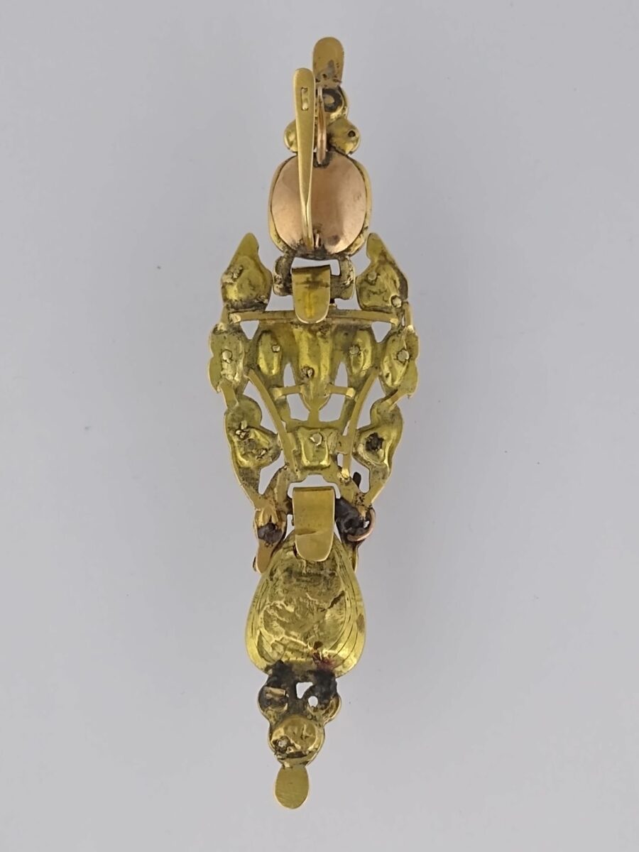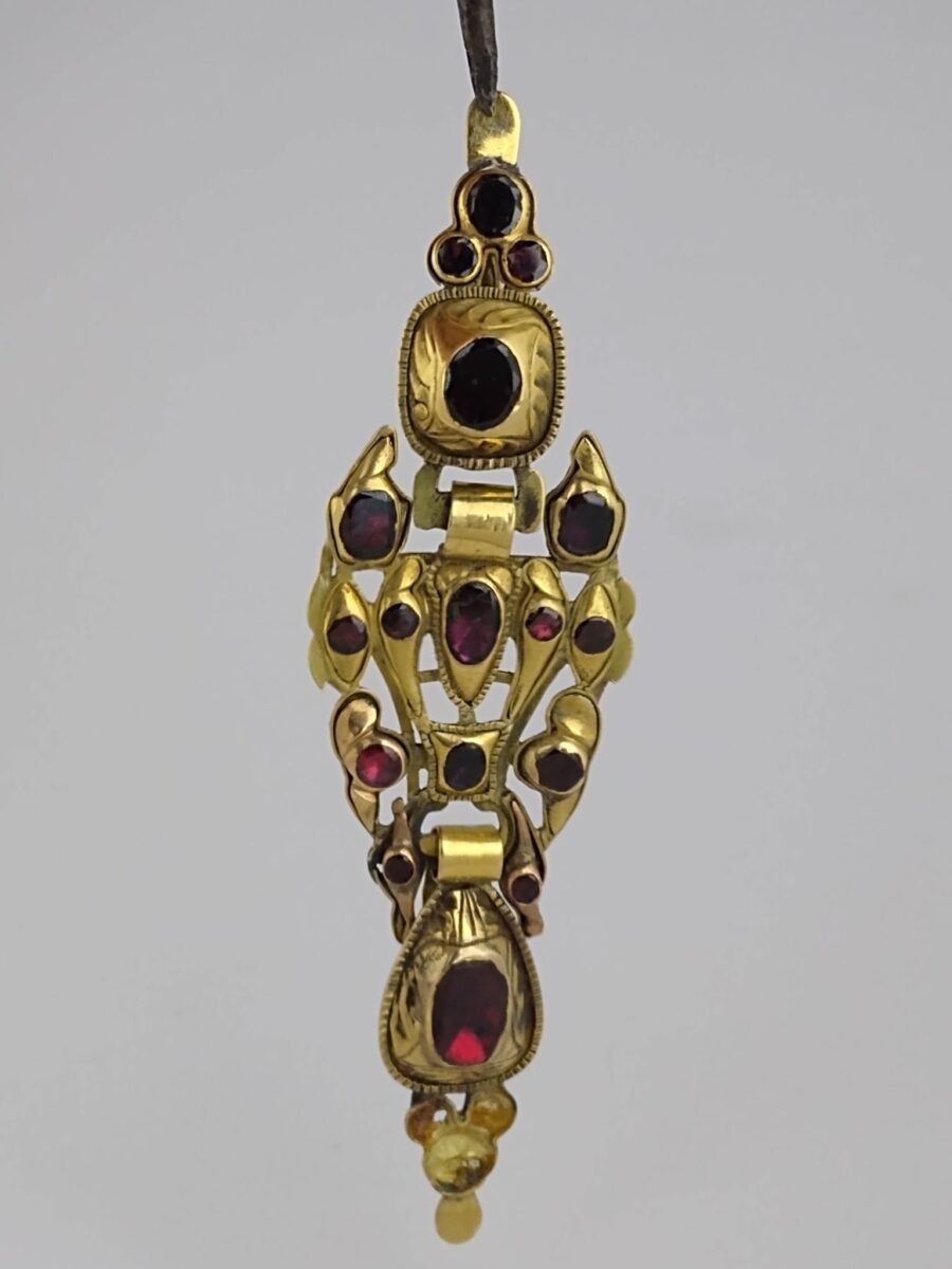 Par de caravanas desmontables s. XVIII en oro amarillo con veinte granates en una y diecisiete en otra (espacio original para veinte). 93 x 25 mm. Peso bruto 22 gr.