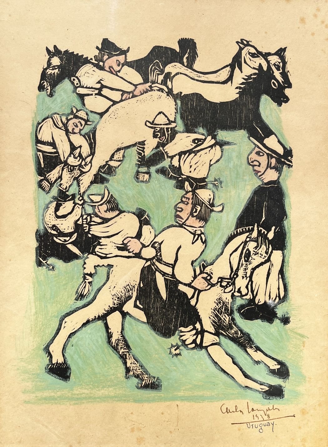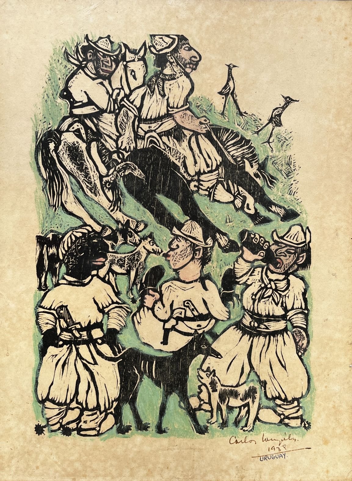 CARLOS GONZÁLEZ (Uruguay, 1905-1933). Par de serigrafías color. «Escenas gauchescas.» Firmados, fechados «1938» y situados «Uruguay» abajo a la derecha. 33 x 23 cm.