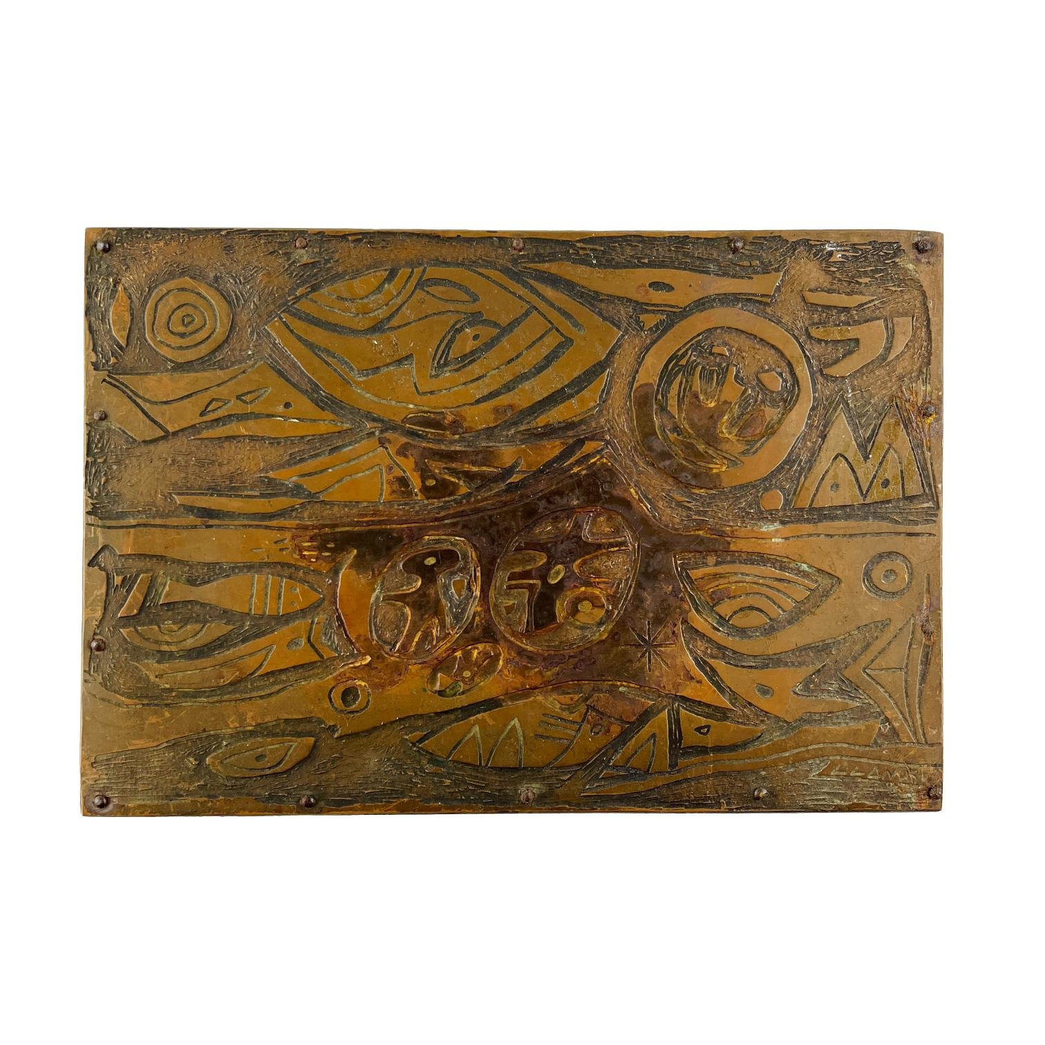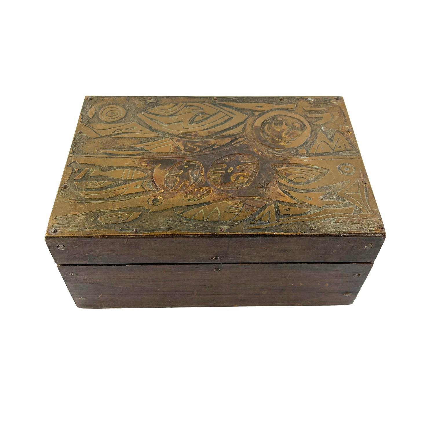 CARLOS LLANOS (Escuela uruguaya, 1930-2014) Caja en madera con tapa forrada en chapa de cobre cincelada «formas» Firmada abajo a la derecha 15 x 22 x 9,5 cm