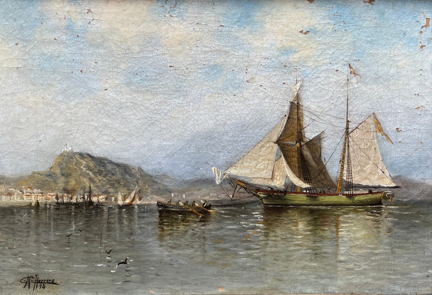 CARLOS MARÍA HERRERA (1875-1914) Óleo sobre tela «Marina en Gibraltar» Firmado y fechado «93» abajo a la izquierda 31 x 45 cm Presenta desprendimientos en óleo