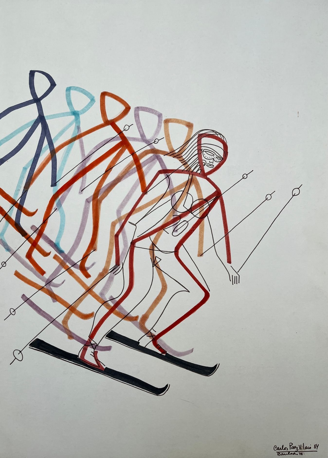 CARLOS PÁEZ VILARÓ (1924-2014) «Esquiadora» Drypen y acuarela sobre cartón Firmado, fechado «84» y situado «Bariloche» abajo a la derecha 69 x 49.5 cm