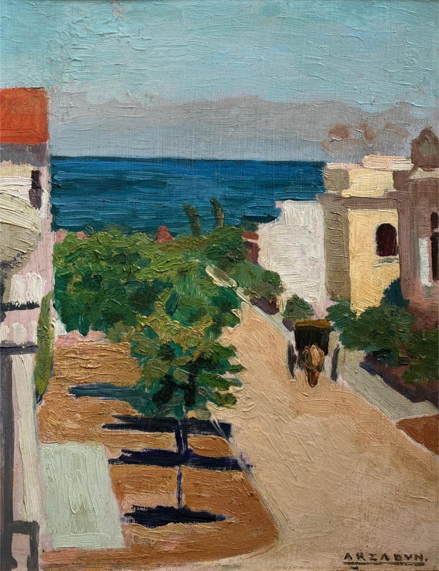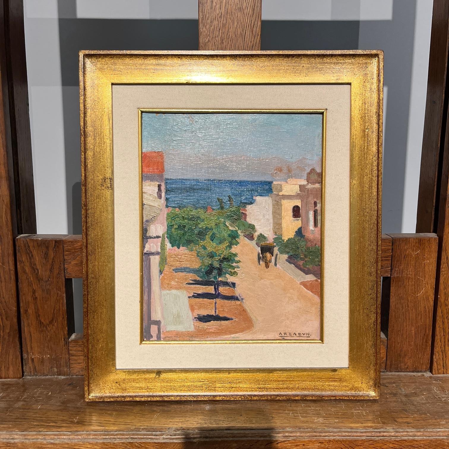 CARMELO DE ARZADUN (Escuela uruguaya, 1888-1968) Óleo sobre cartón «Calle de Punta del Este» 21.5 x 27 cm Presenta pequeños desprendimientos en óleo