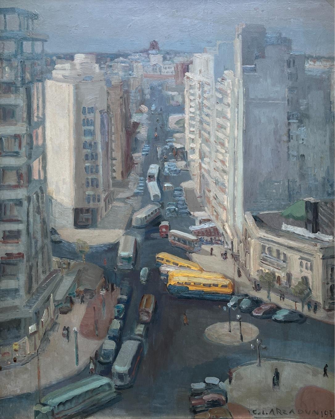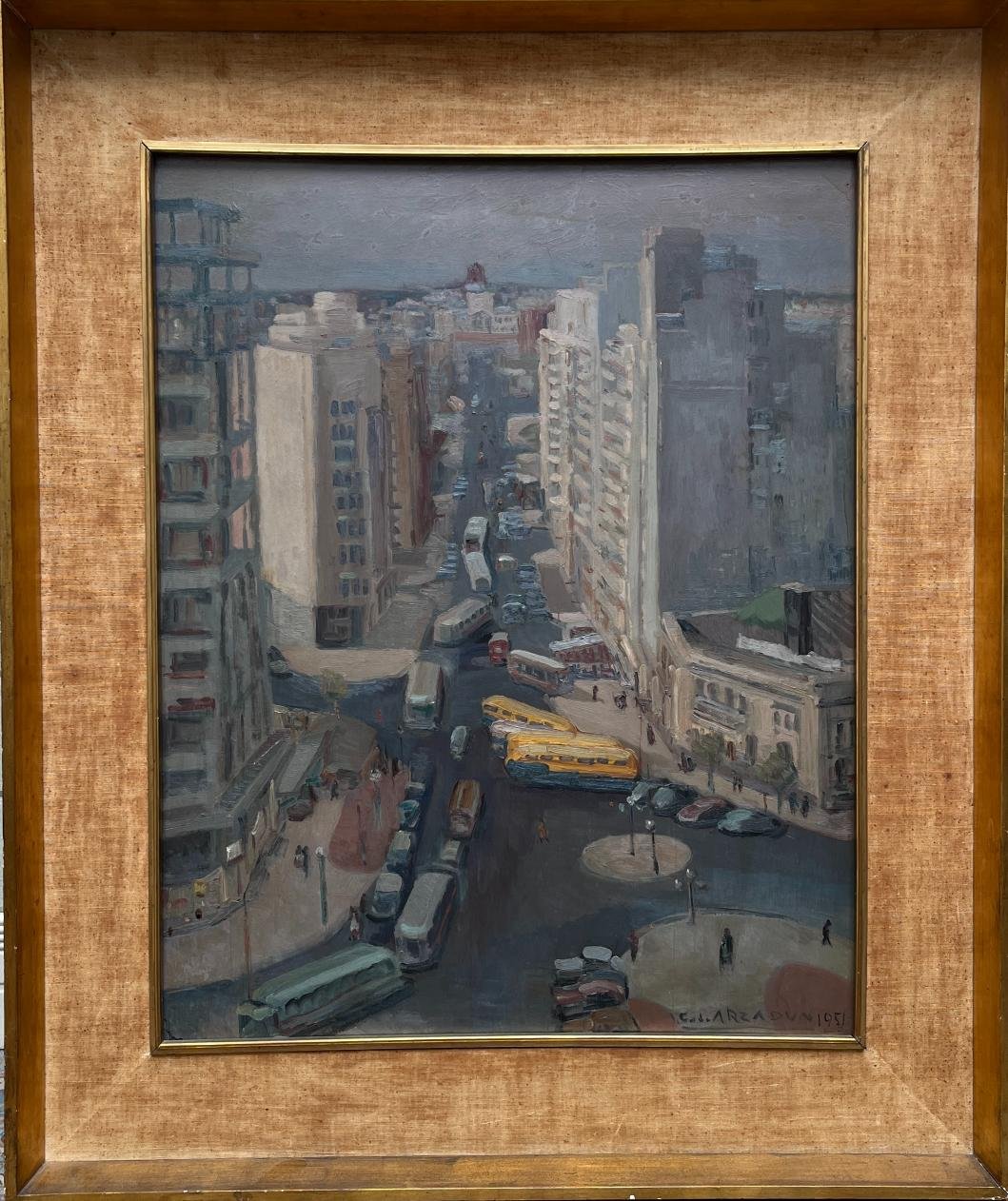 CARMELO DE ARZADUN (Escuela uruguaya, 1888-1968) Óleo sobre madera «Avenida Agraciada de Montevideo» Firmado y fechado «1951» abajo a la derecha 77 x 60 cm