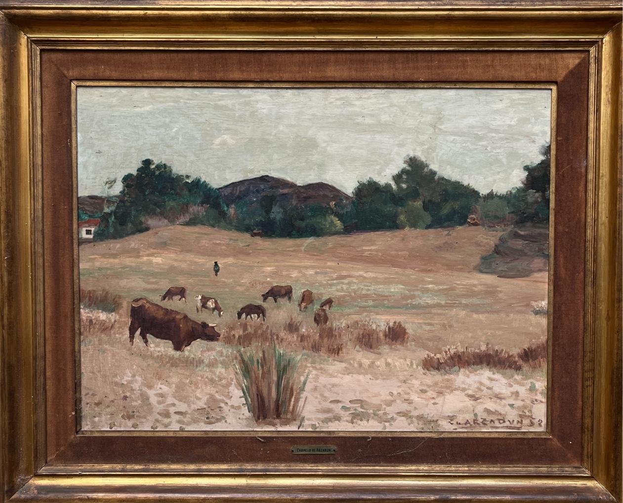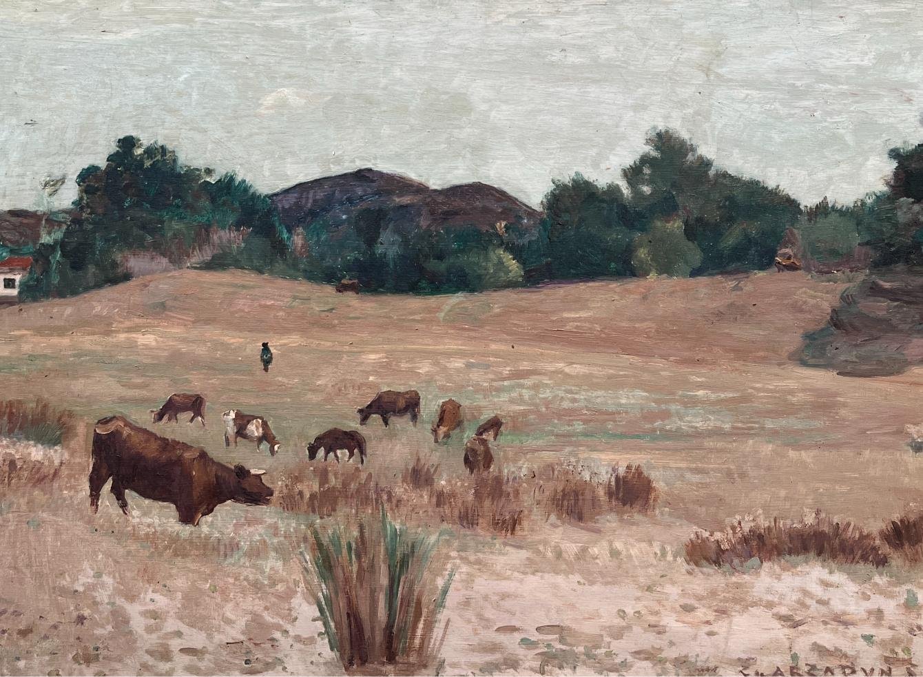 CARMELO DE ARZADUN (Escuela uruguaya, 1888-1968) Óleo sobre tabla «Ganado pastando en Las Flores, Maldonado» Firmado y fechado «52» abajo a la derecha 53 x 73 cm