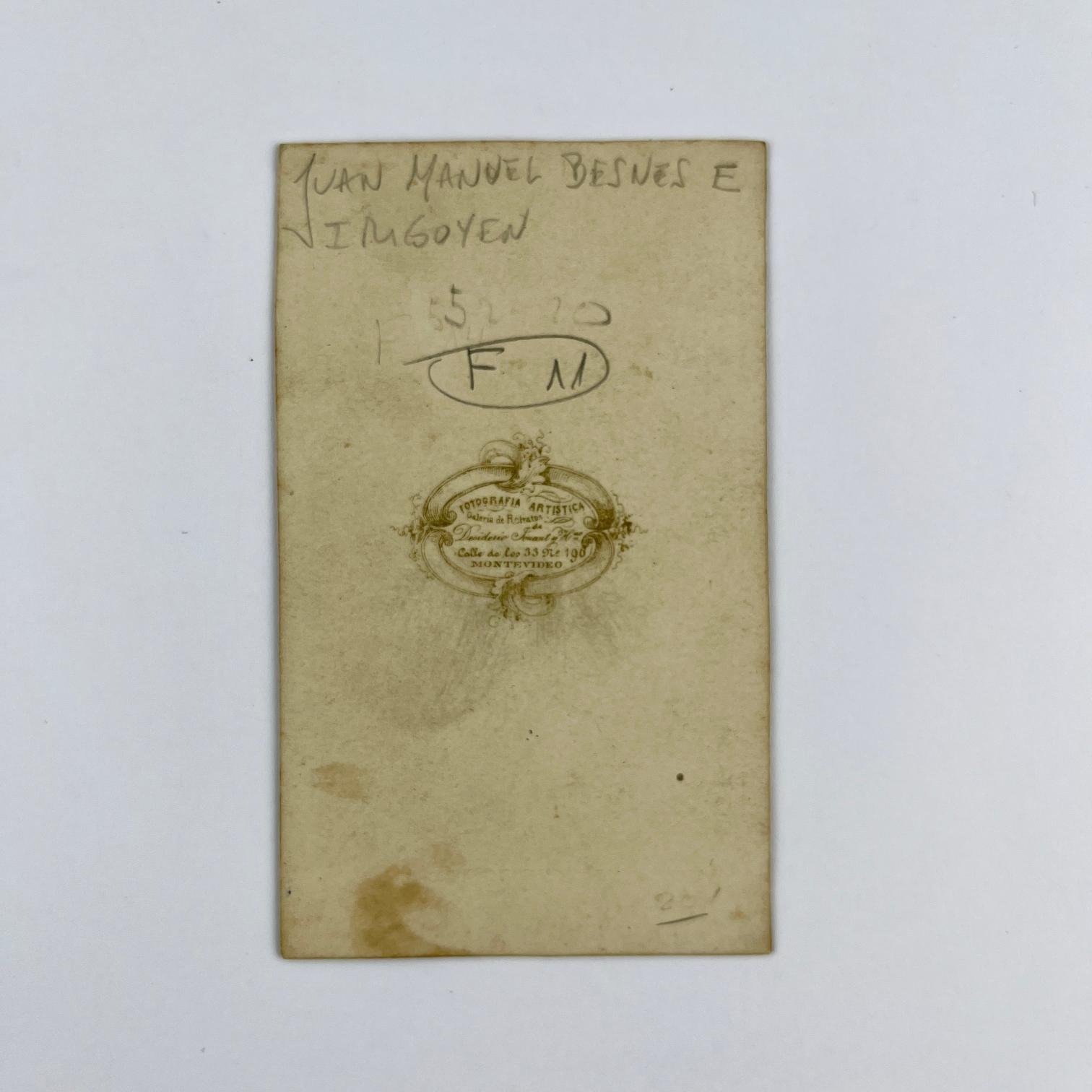 Carte de visite. «Juan Manuel Besnes e Irigoyen», dibujante, acuarelista y calígrafo español de destacada actuación en el Uruguay y aporte a la iconografía histórica nacional Desiderio Jouant y Hno., Montevideo.
