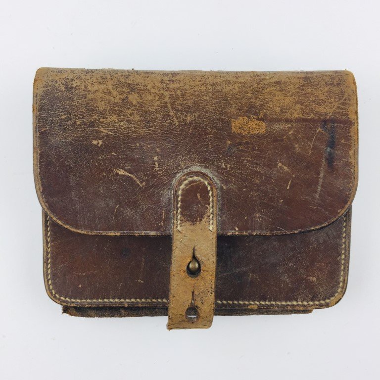 Lote de dos piezas: cartucherín militar francés en cuero marrón fabricado por H. Marquis y portahacha militar en cuero.