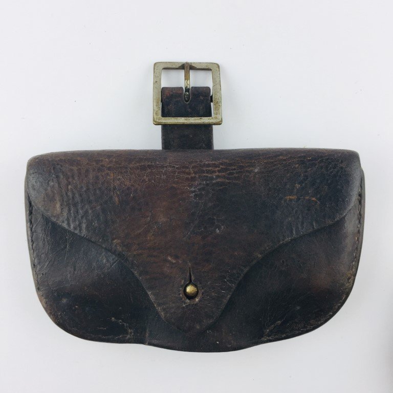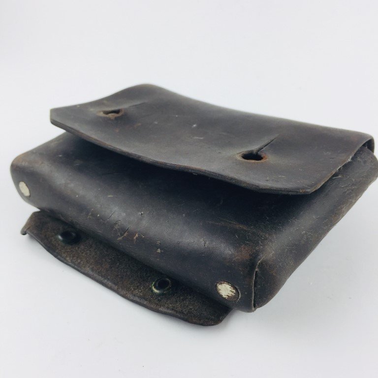 Cartucherín militar en cuero para fusil Garand de fabricación uruguaya, utilizado por el Servicio de Intendencia del Ejército, con siglas repujadas.