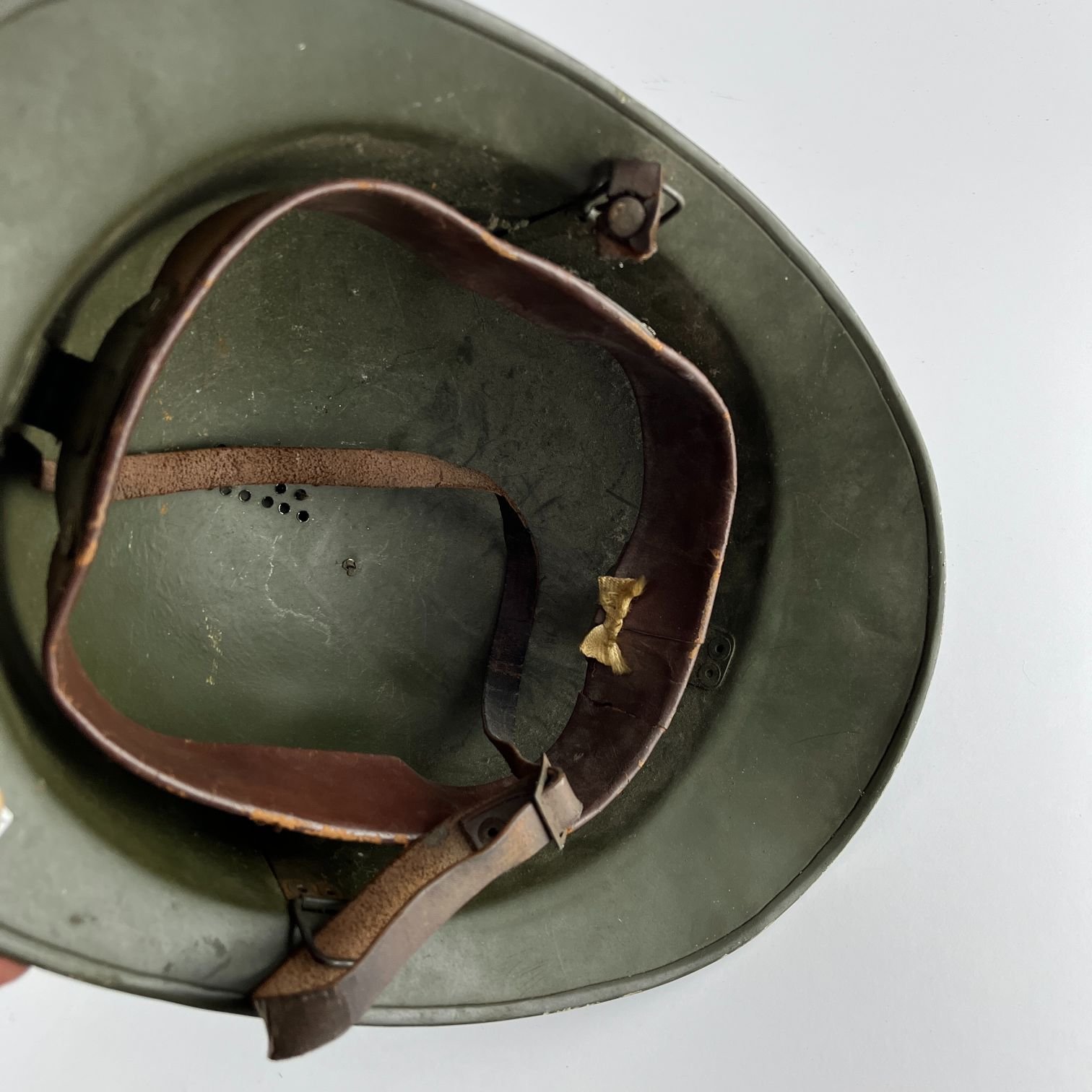 Casco Adrián uruguayo en acero con escudo frontal en aluminio estampado pintado color verde. Interior incompleto.