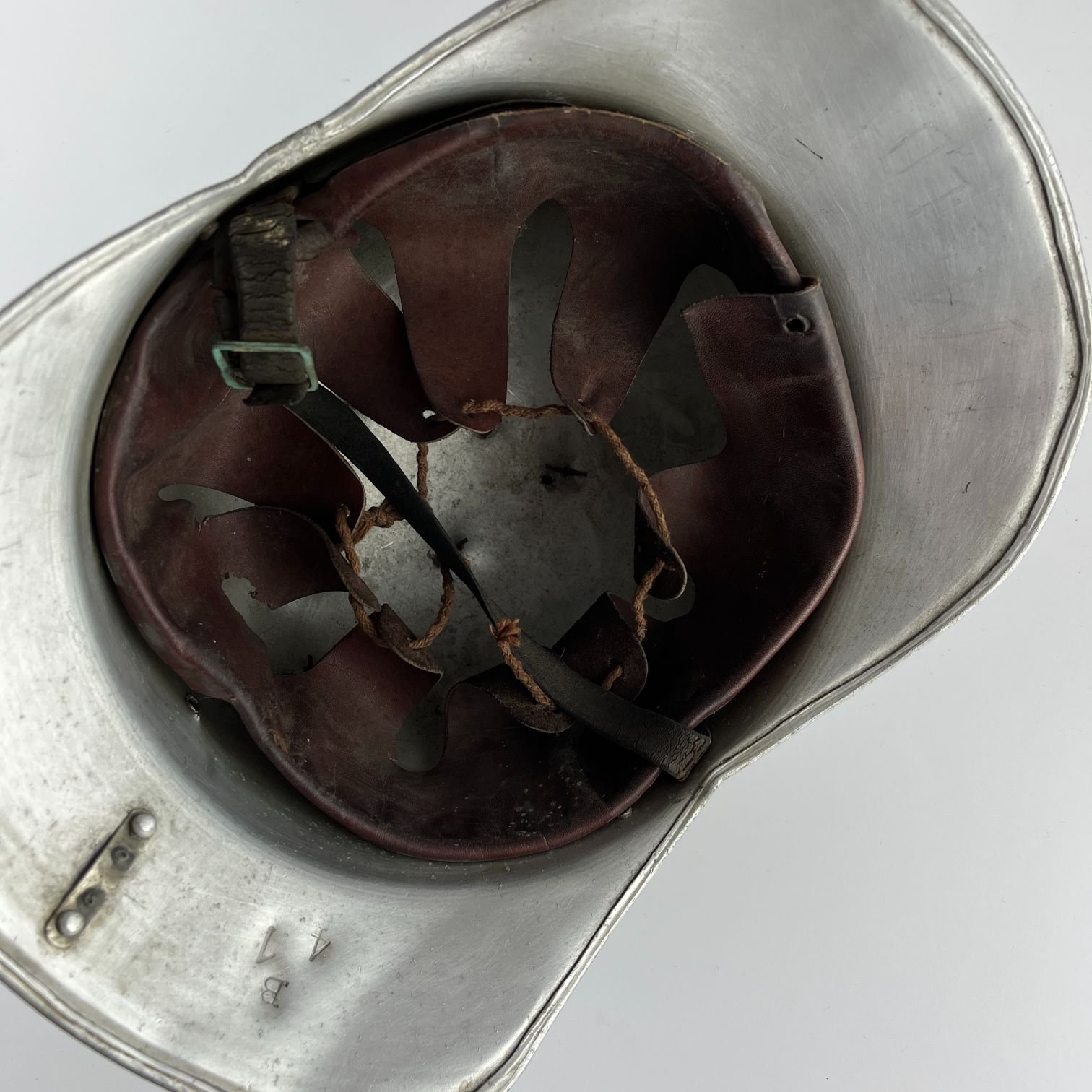 Casco de bombero s. XIX en aluminio con insignia frontal y cresta en bronce. Interior completo.