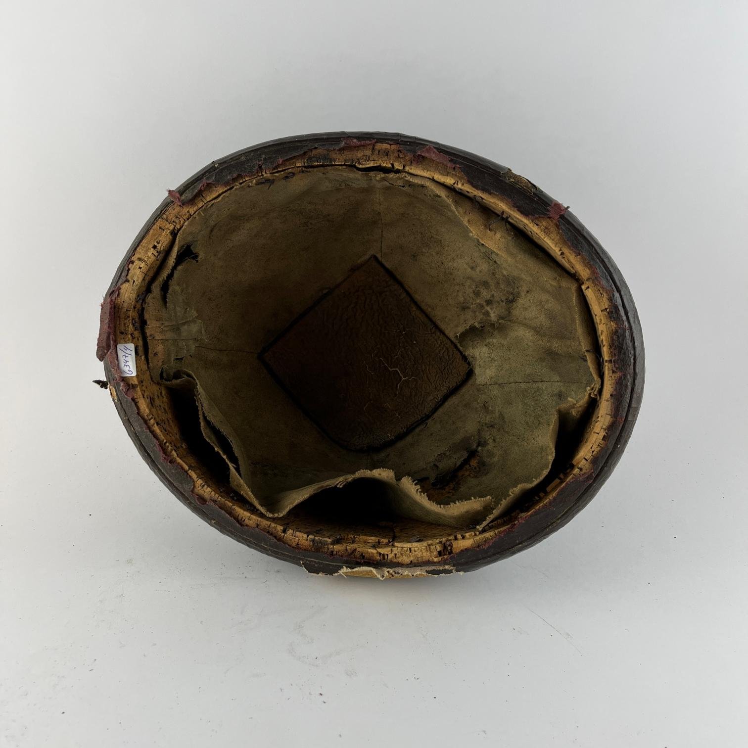 Casco en corcho forrado en cuero marrón. Interior averiado.