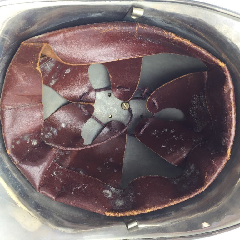 Casco en metal niquelado perteneciente al escuadrón de caballería de escolta del Gral. Franco, con sede en el Palacio de El Pardo. Pico y laterales en bronce estampado, insignia frontal en bronce esmaltado, barboquejo doble en aros de latón dorado con forro en paño rojo. Interior en cuero marrón, completo.