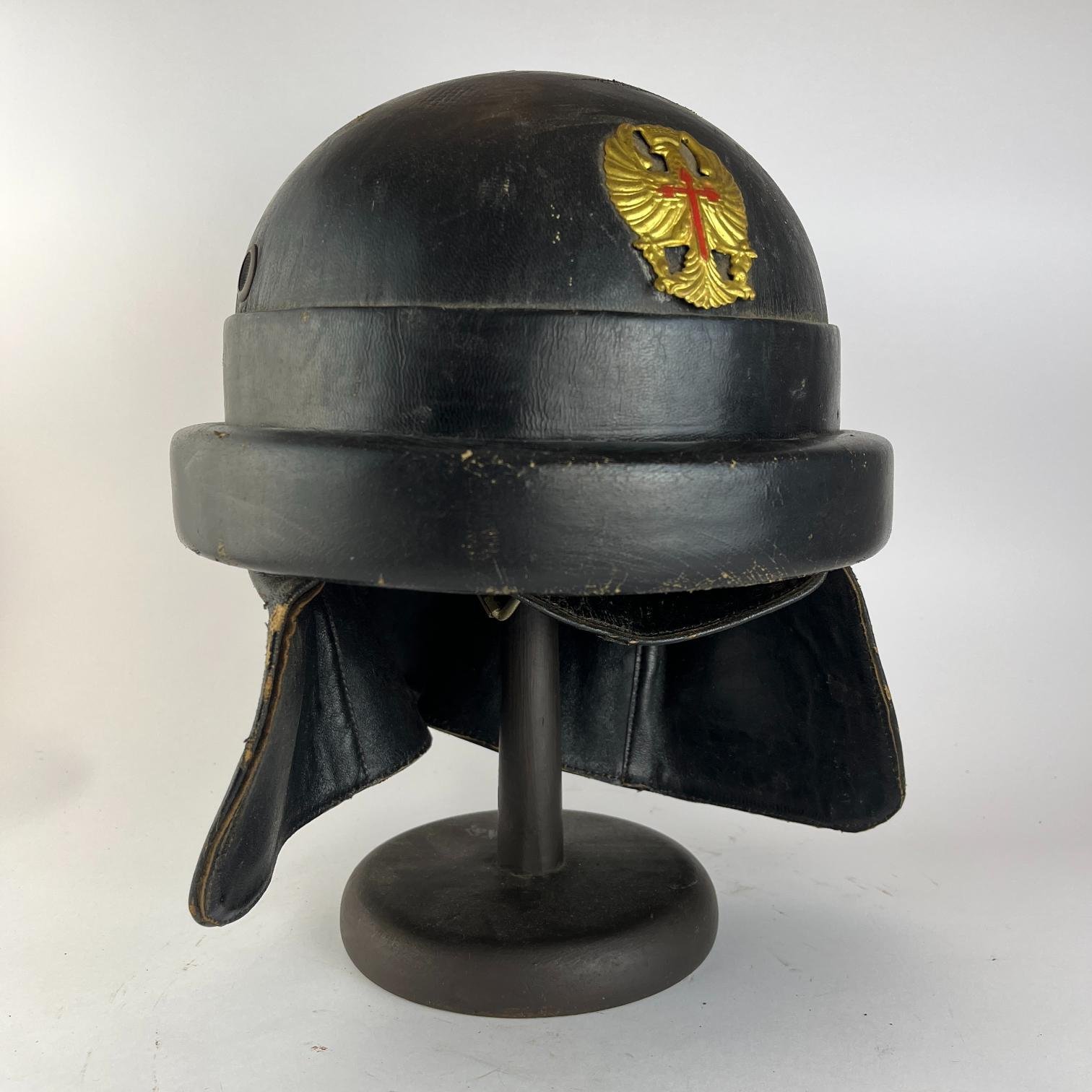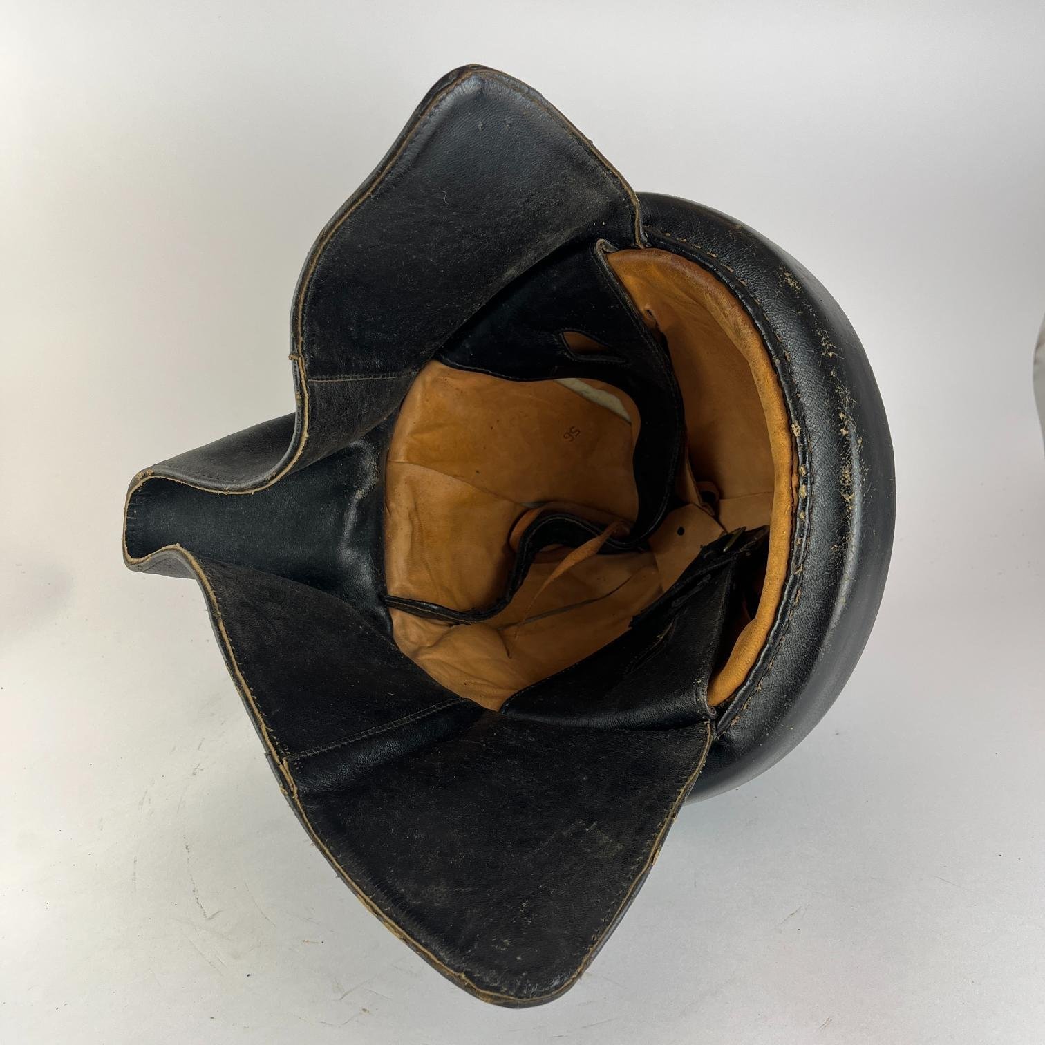 Casco de tanquista español M35, en cuero, con insignia. Interior completo. Décadas 1940-50.