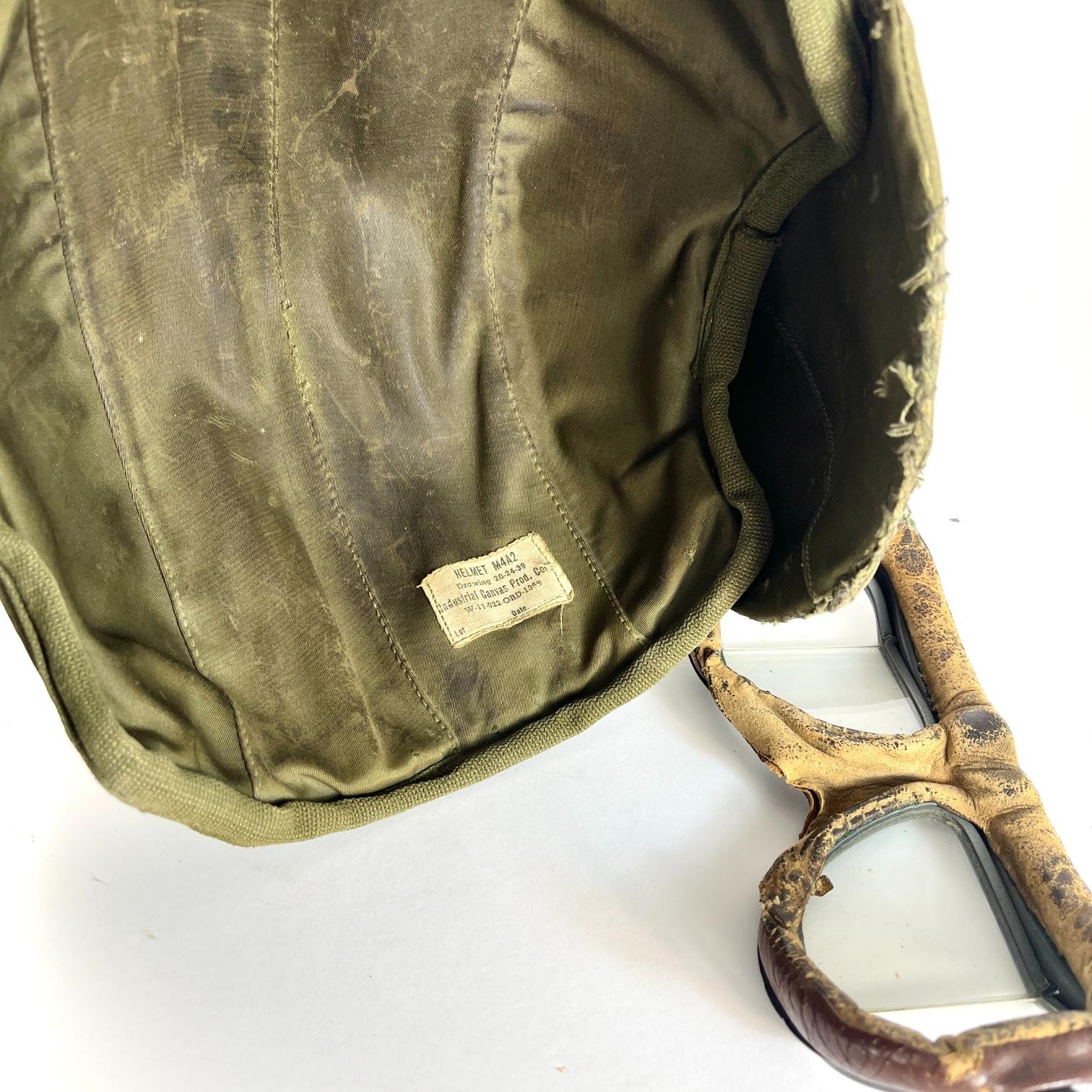 Casco estadounidense Flak M4A2, en acero forrado en lona color verde, de tripulación de bombardero. Insignia frontal pintada. Interior completo. Con antiparras. WWII.