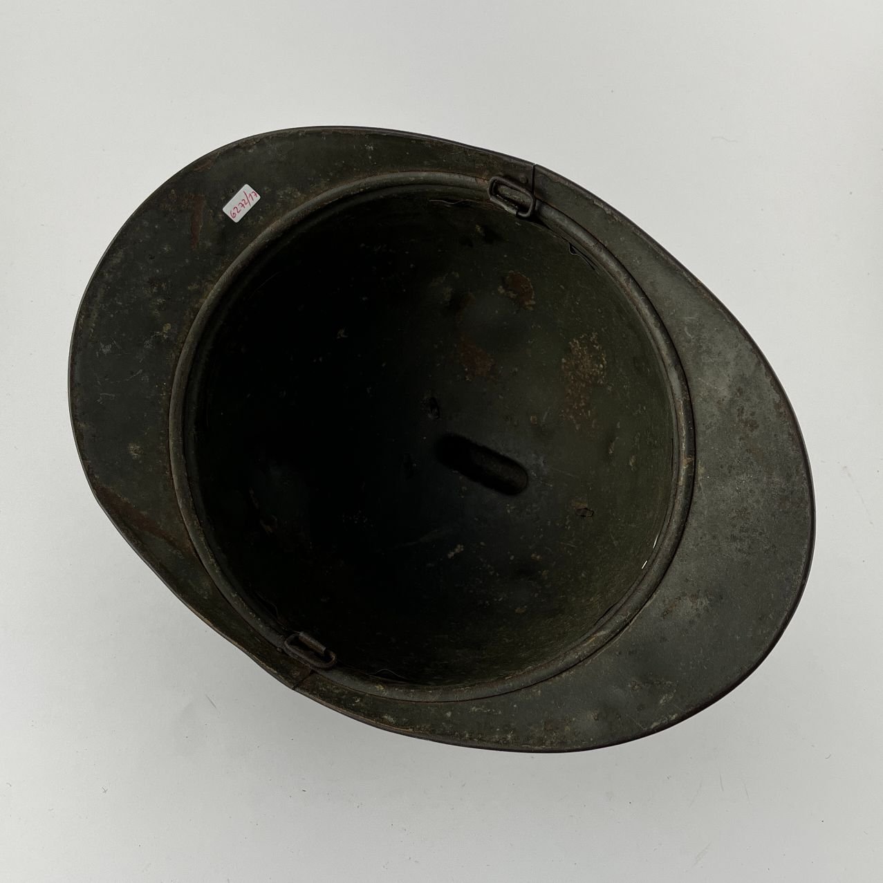 Casco francés Adrián en acero pintado color verde, con varios impactos de proyectil. Interior incompleto. WWI.