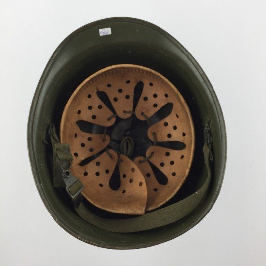 Casco militar de la República Federal Alemana, modelo FJ60 (M-62), en acero pintado color verde. Interior completo con pequeñas averías.
