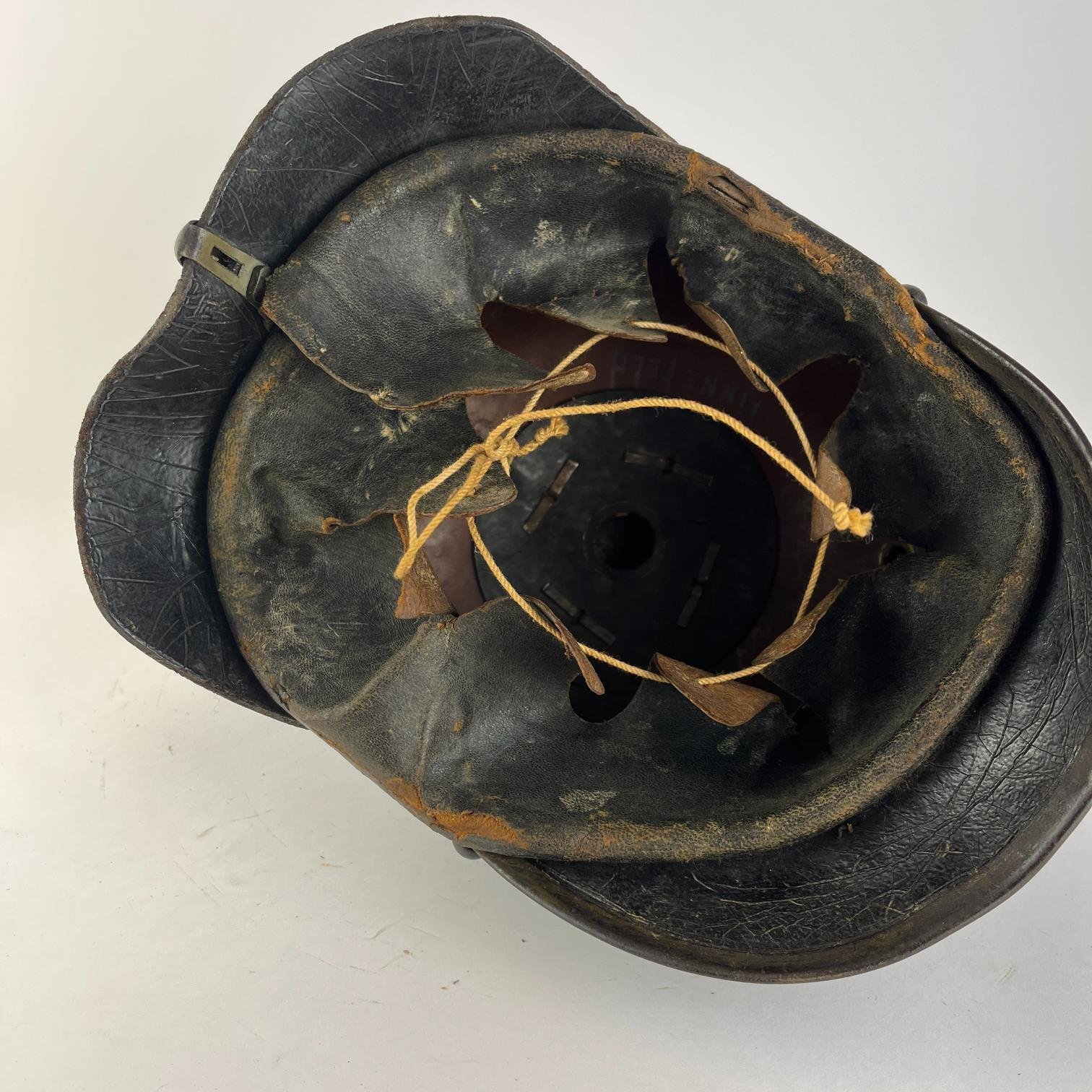 Casco pickelhaube prusiano M1897, en cuero negro y metal, con insignia frontal en latón. Interior completo. Falta barboquejo. Con averías.