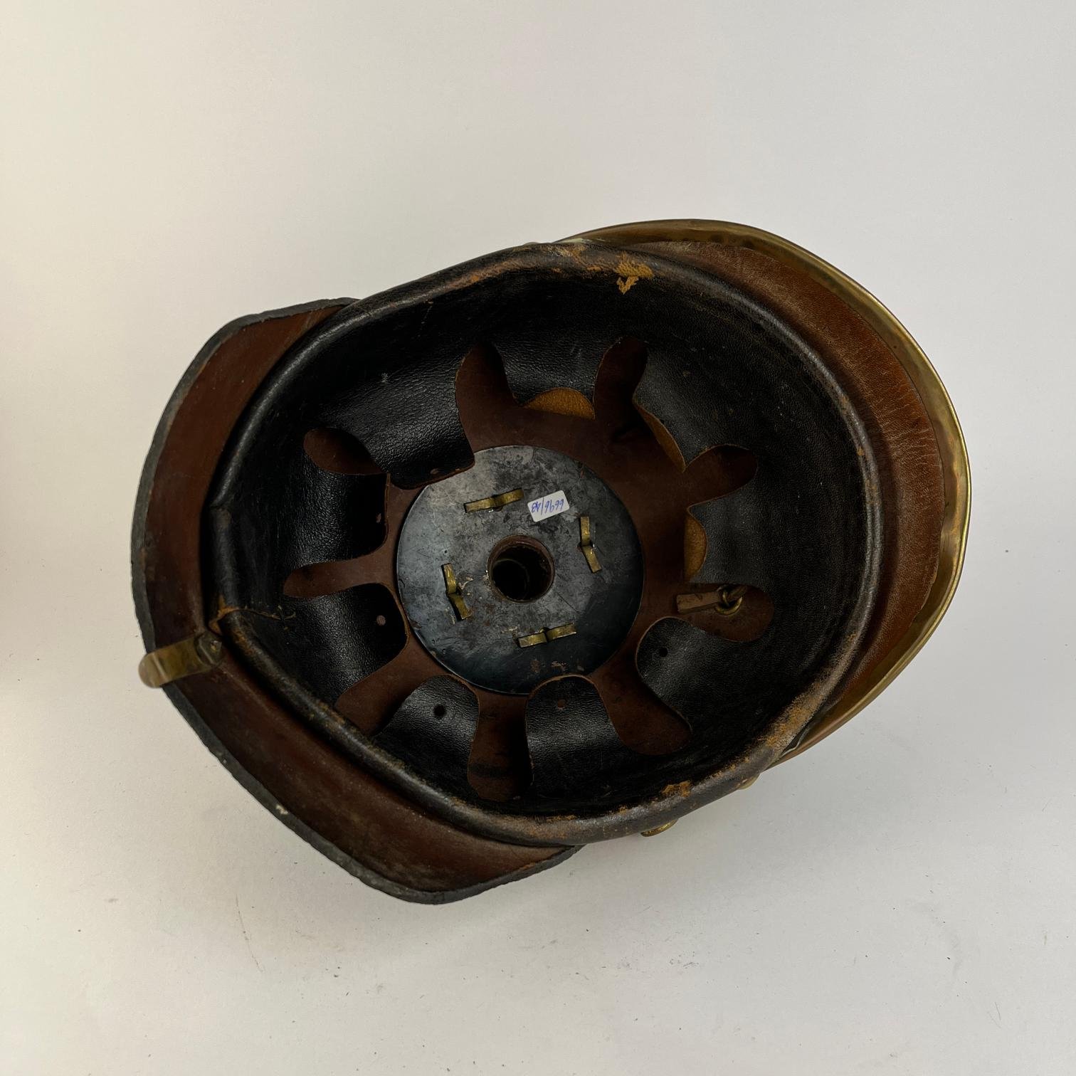 Casco pickelhaube prusiano, M1897, en cuero y bronce. Insignia frontal y carrilleras escamadas. Interior completo.