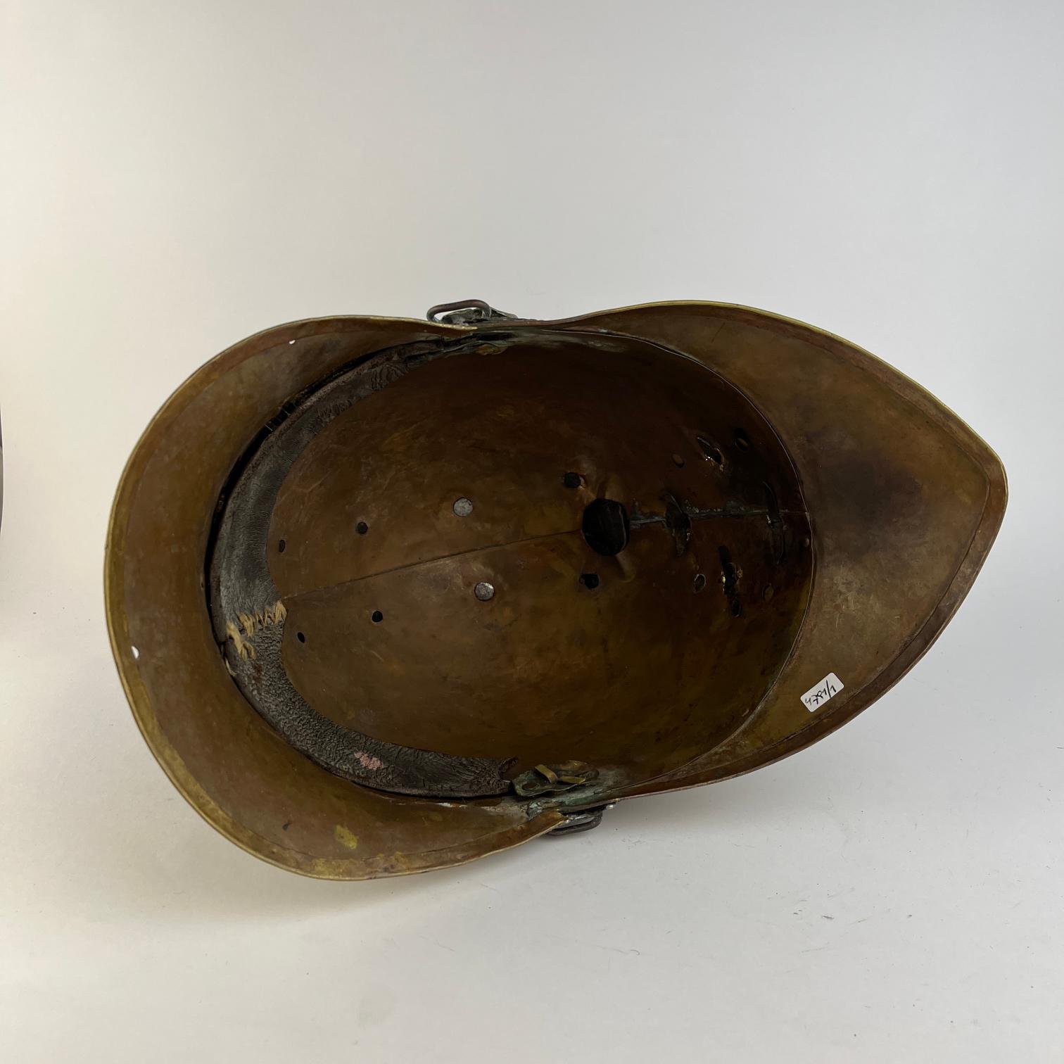 Casco suizo, s. XIX, en bronce, con escudo frontal de la ciudad de Berna en bronce estampado. Laterales decorados con leones y crespa en felpa negra.