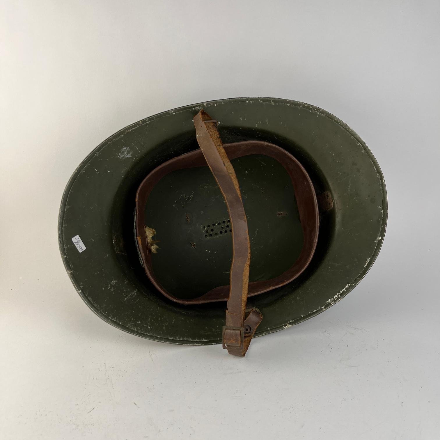 Casco tipo Adrián del ejército uruguayo, en aluminio, pintado en color verde, con insignia frontal. Interior completo.
