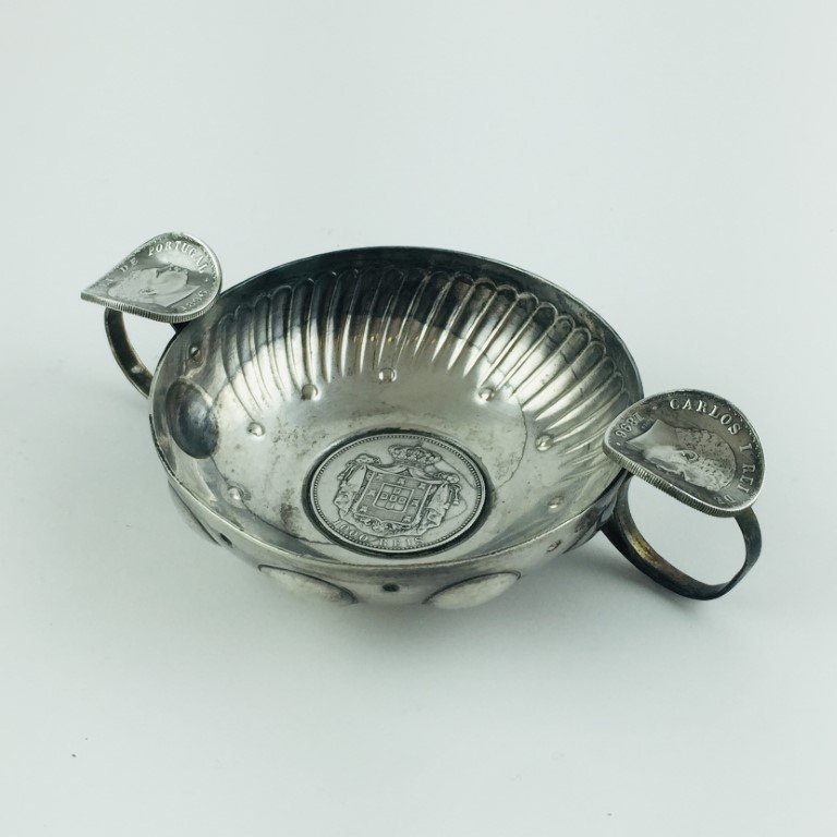 Catador para vino en plata portuguesa 833, repujado y decorado con moneda denominación 1000 reis de 1899. Dos asas decoradas con monedas. 5 x 16 x 10 cm. Peso 154 gr.