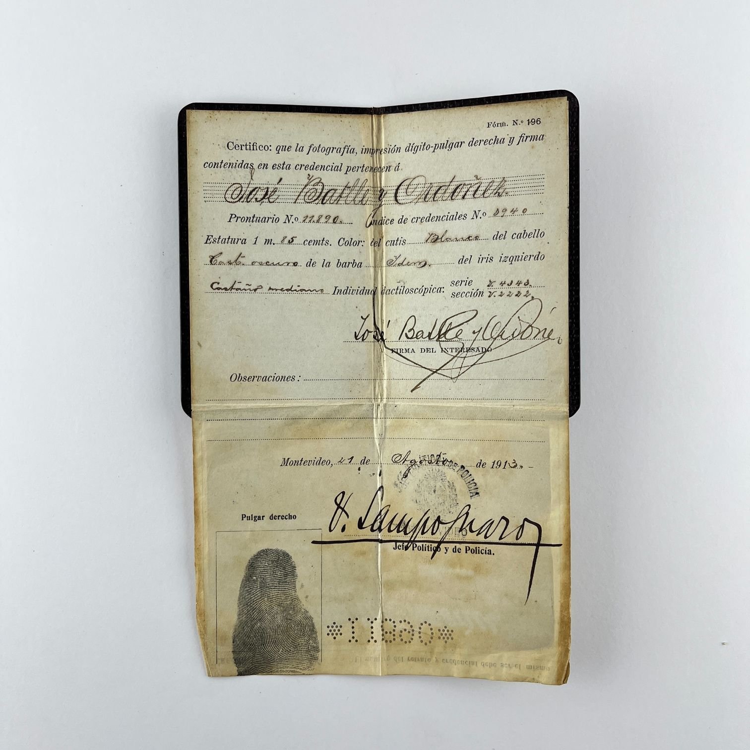 Cédula de identidad perteneciente al «Excmo. Señor Presidente de la República D. José Batlle y Ordóñez», expedida el 21 de agosto de 1913 por el Jefe Político y de Policía de Montevideo, con firma y fotografía de frente y perfil de José Batlle y Ordóñez. Encuadernación original en cuero con letras estampadas en dorado.