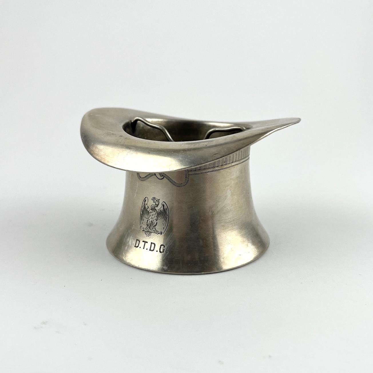 Cenicero inglés en metal plateado esculturado «galera o sombrero de copa». Con blasón «ave fénix» e iniciales «D.T.D.G.»