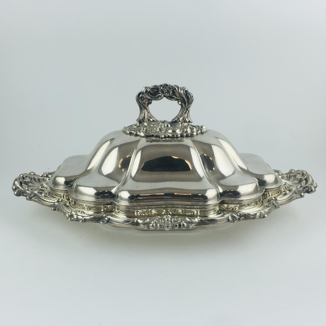 Centro de mesa inglés en metal plateado Piña de Freccero con asas y tiradores cincelados «valvas» y «flores». 38 x 23 x 18 cm.
