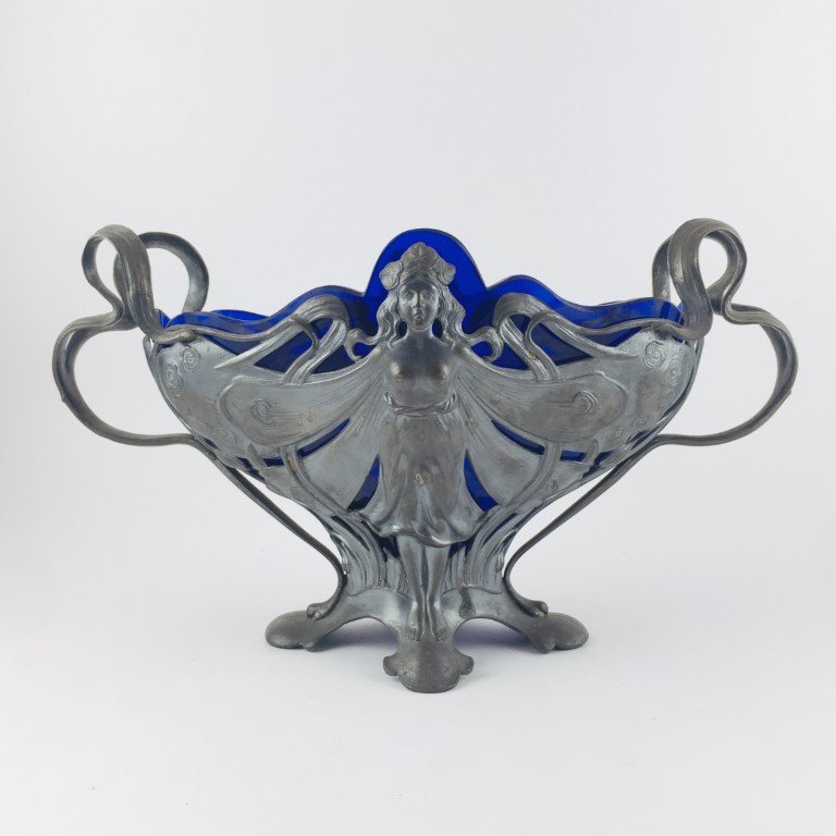 Centro de mesa art nouveau tipo jardinera, en metal decorado «dama alada». Depósito en cristal azul. 19.5 x 35 x 17.5 cm.