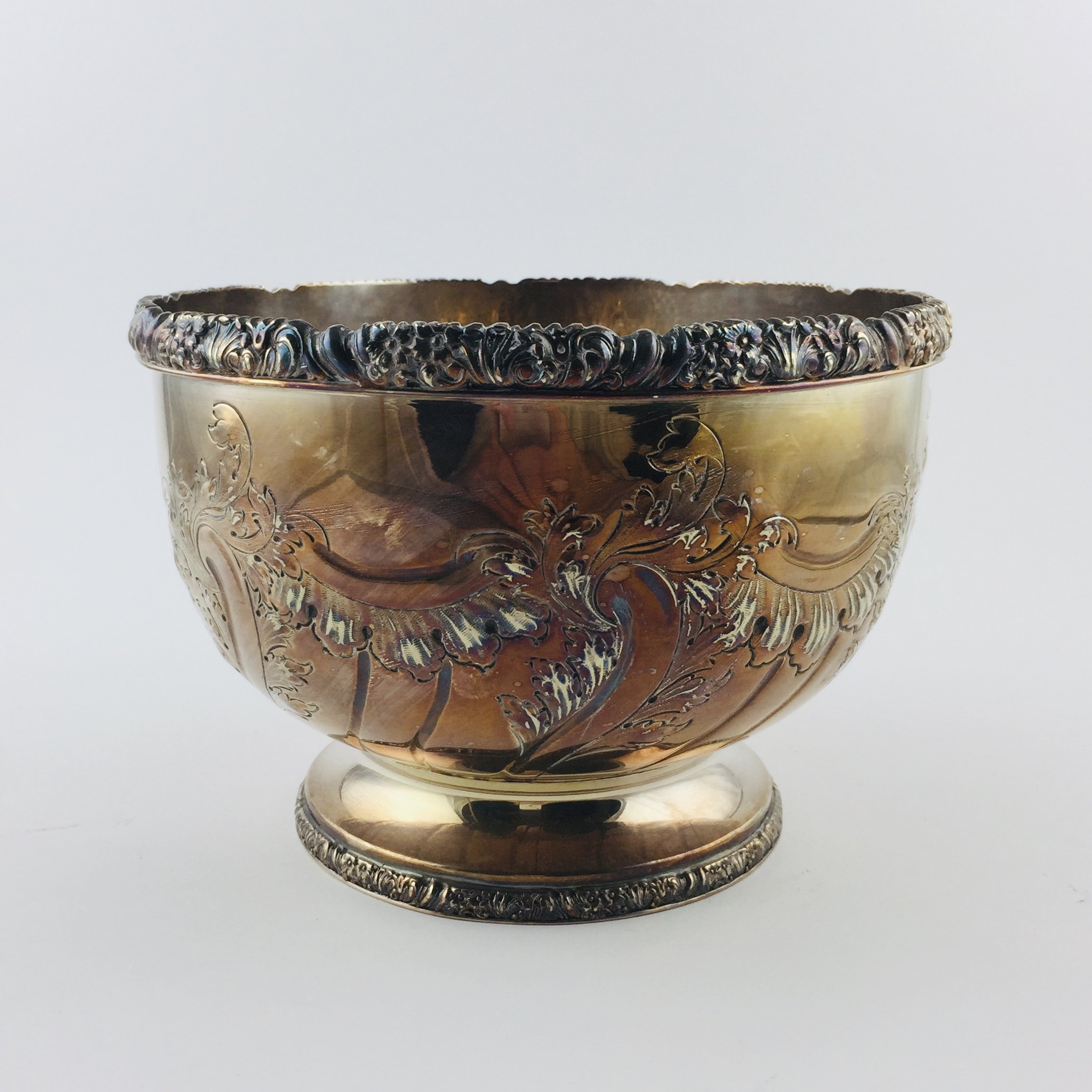 Centro de mesa redondo en metal plateado inglés cincelado «hojas». 15 x 20 cm.