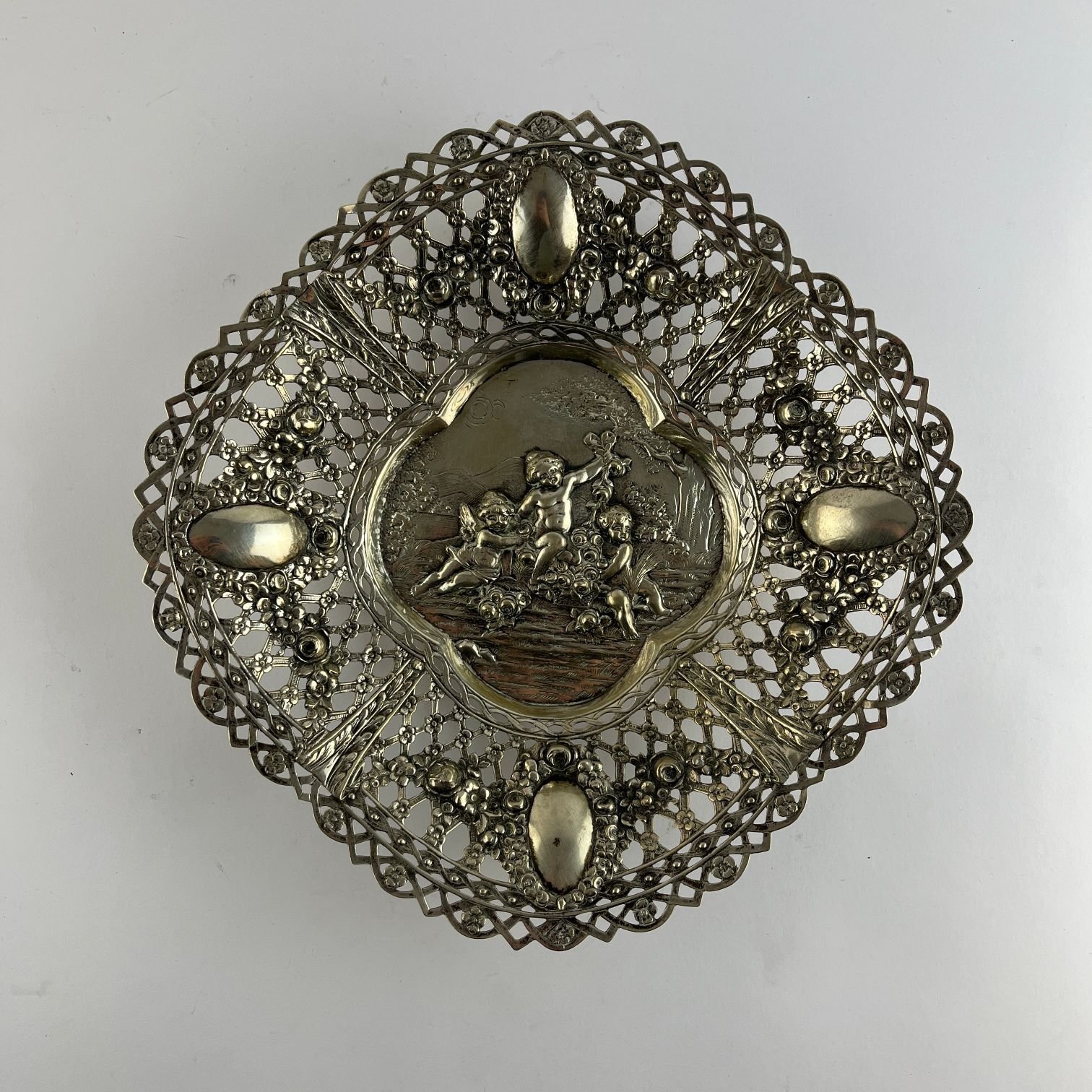 Centro de mesa cuadrado en plata calada, repujada y cincelada «niños y ángeles». 4 x 24 x 24 cm. Peso 300 gr.