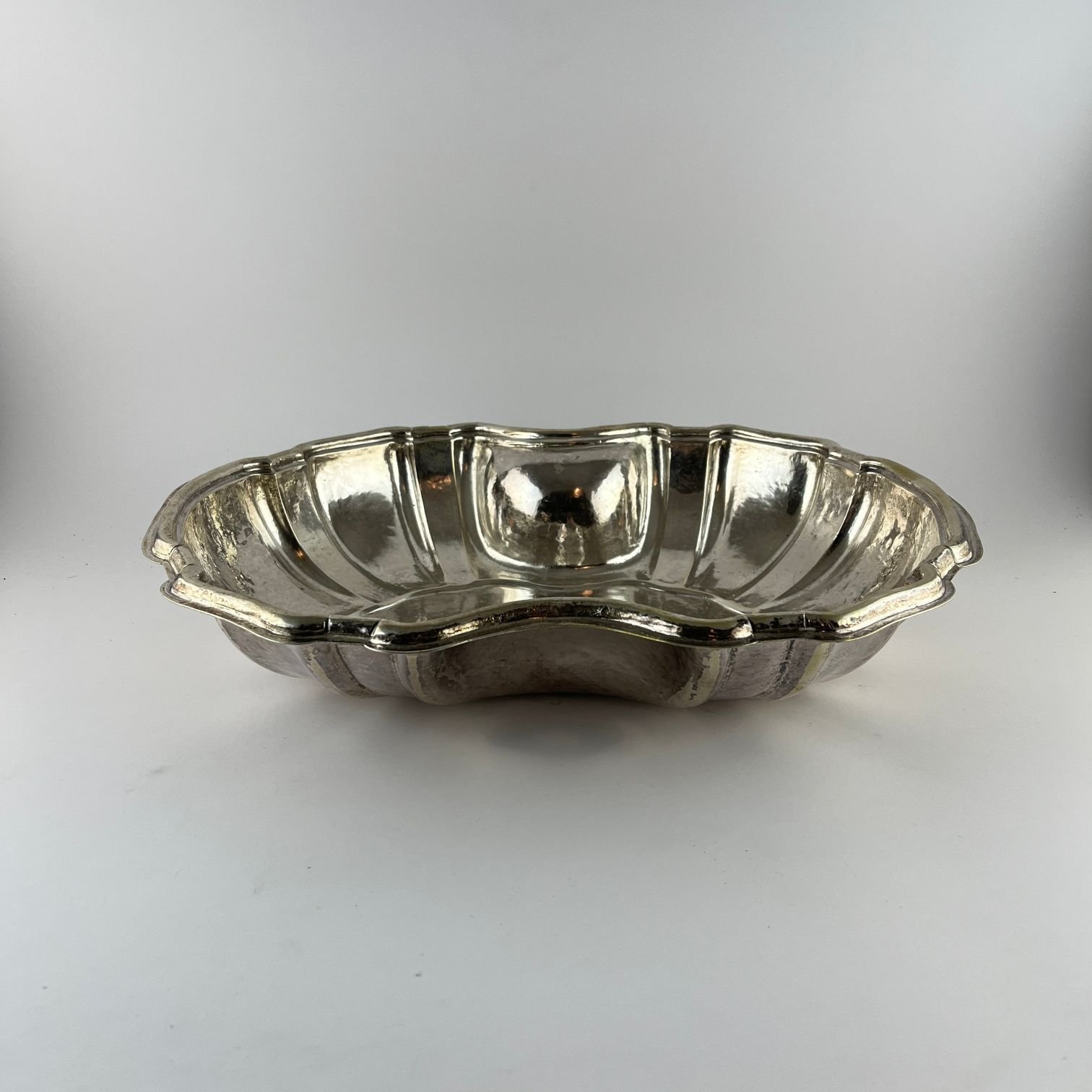Centro de mesa italiano en plata martelé con borde en ondas, con punzón del orfebre Chiappe. 7 x 37 x 28.5 cm. Peso 1.050 gr.