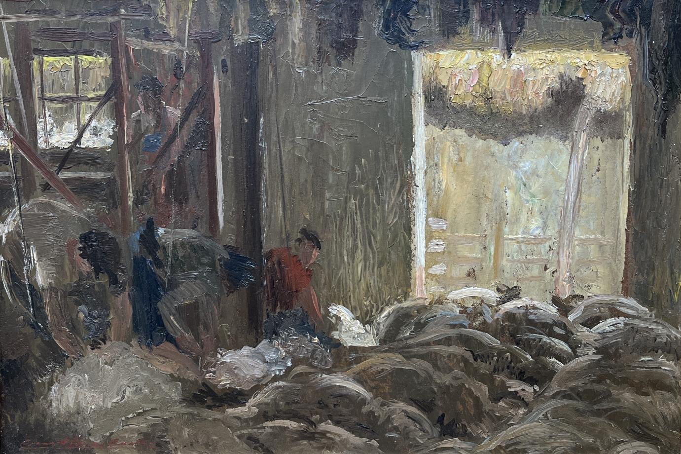 CÉSAR PESCE CASTRO (1890-1977) Óleo sobre fibra «Galpón de esquila» Firmado abajo a la izquierda 24 x 35 cm