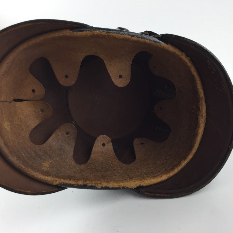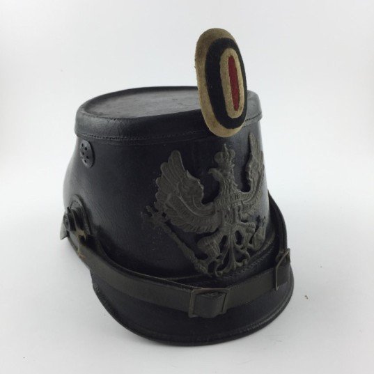 Chacó prusiano en cuero negro con insignia en metal estampado. Interior incompleto.
