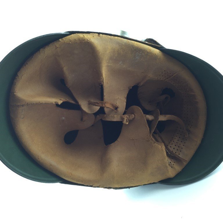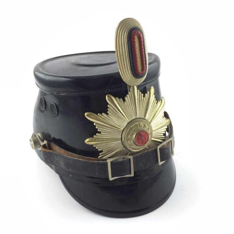 Chacó prusiano en polímero negro con insignia frontal en metal plateado y esmalte. Barboquejo en cuero. Interior completo.