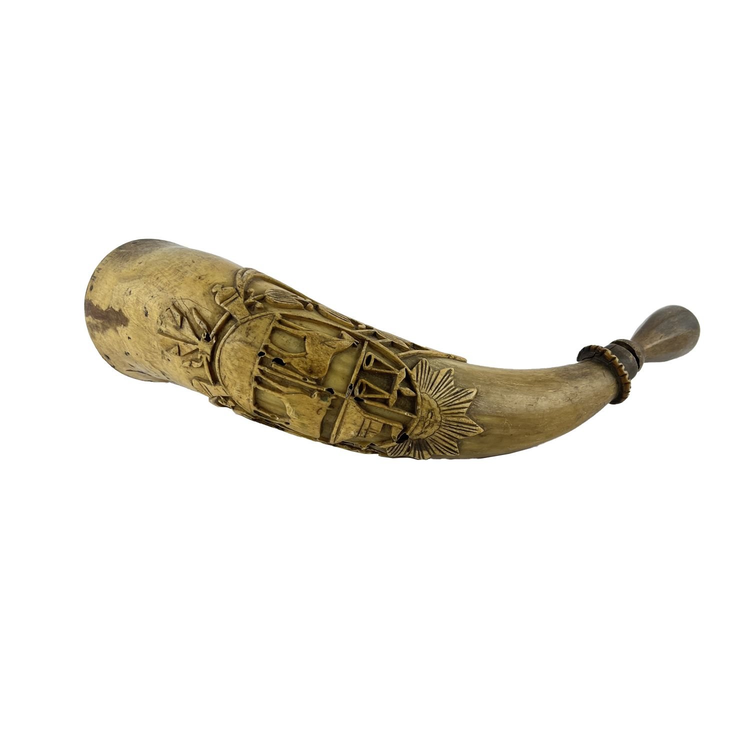 Chifle en guampa tallada “escudo de armas uruguayo antiguo”. Largo 32 cm.