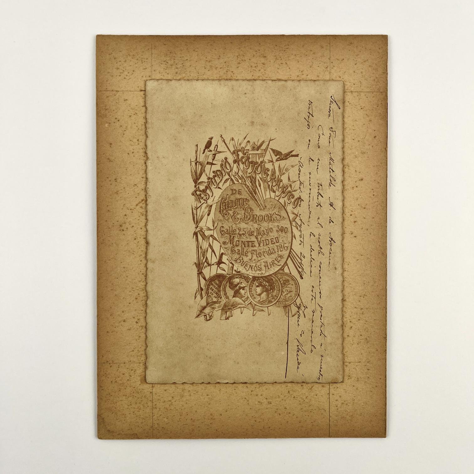 Fotografía sobre gelatina de plata virada al sepia -medidas: 15,8 x 10,2 cm-, montada sobre un cartón del fotógrafo (16,5 x 10,6 cm), con sello publicitario al dorso y manuscrita, una dedicatoria firmada: “Señora Doña Matilde A. de Arocena. / Como un tributo al noble concurso prestado a nuestros trabajos en la enseñanza, le dedico este recuerdo. Montevideo Agosto 24/90. Francisco Bauzá”.