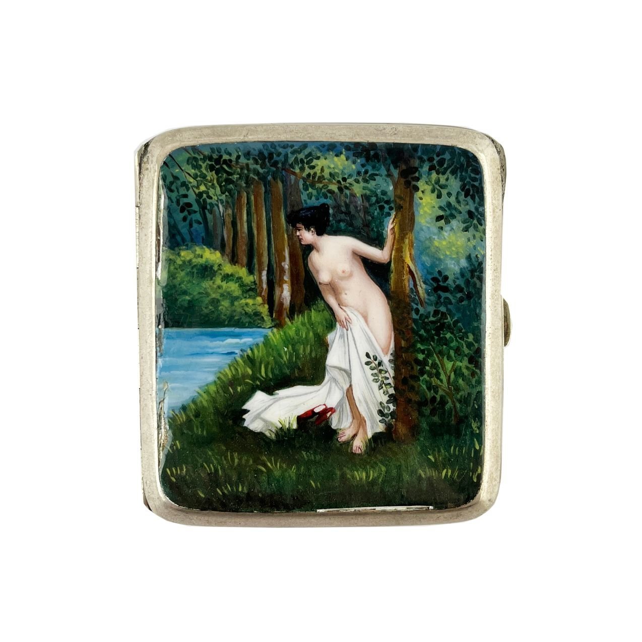 Cigarrera de bolsillo europea en alpaca, con tapa decorada en esmalte. «Desnudo femenino.» Interior vermeil. Pequeñas cascaduras en borde esmalte. 8.5 x 8 cm.