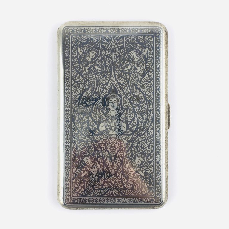 Cigarrera de bolsillo en plata Sterling de Siam. Tapas nieladas, la frontal decorada “deidad oriental”. Dedicatoria grabada en interior. 14 x 8.5 cm.