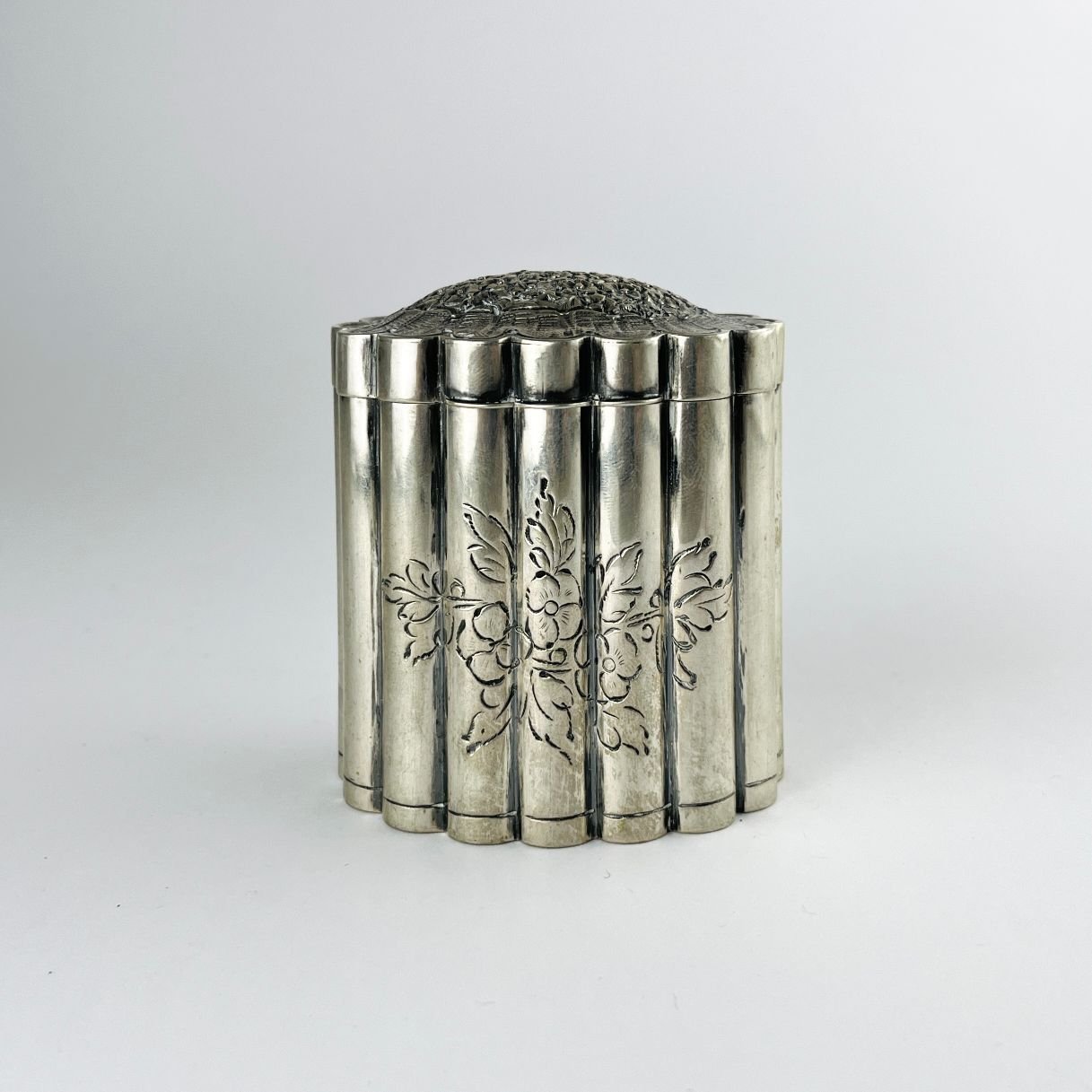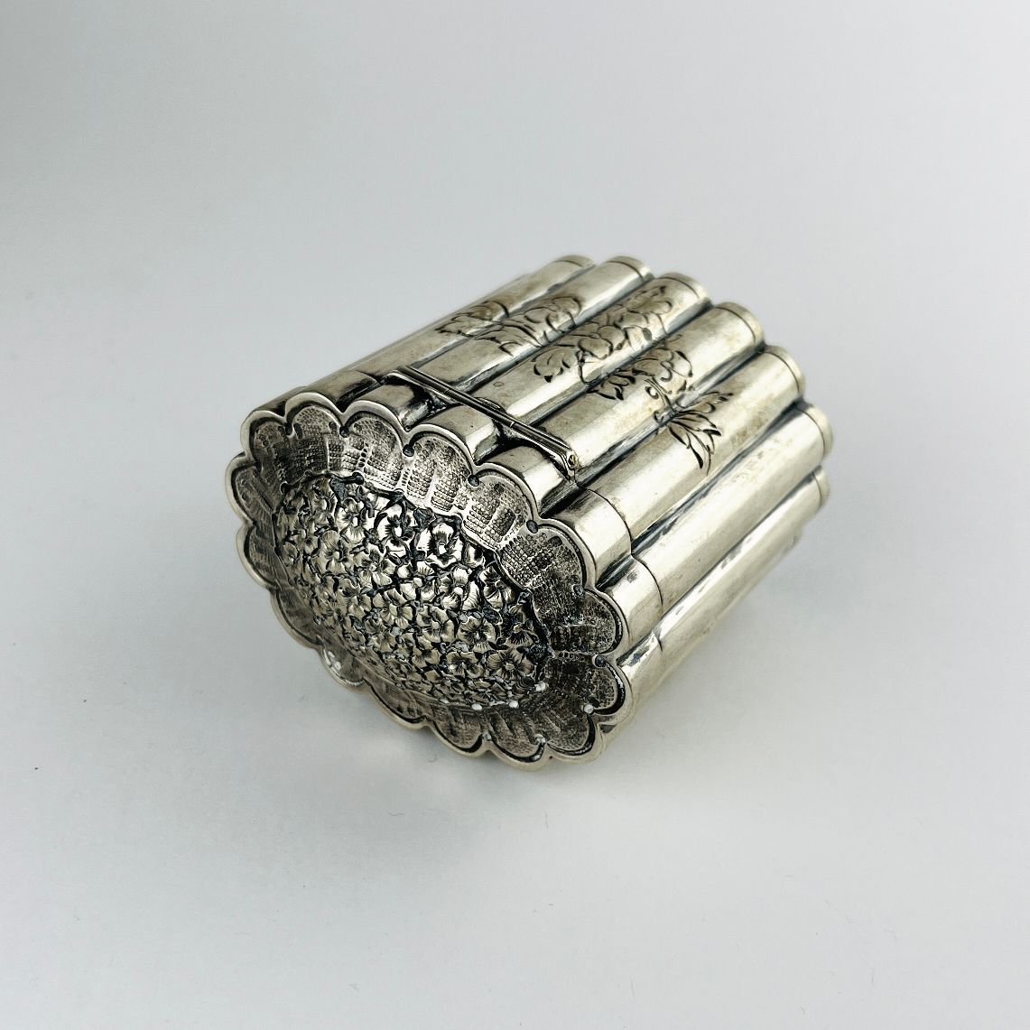 Cigarrera italiana oval de sobremesa en plata lobulada y cincelada “hojas y flores”. 8.5 x 7.5 x 6 cm. Peso 145 gr.