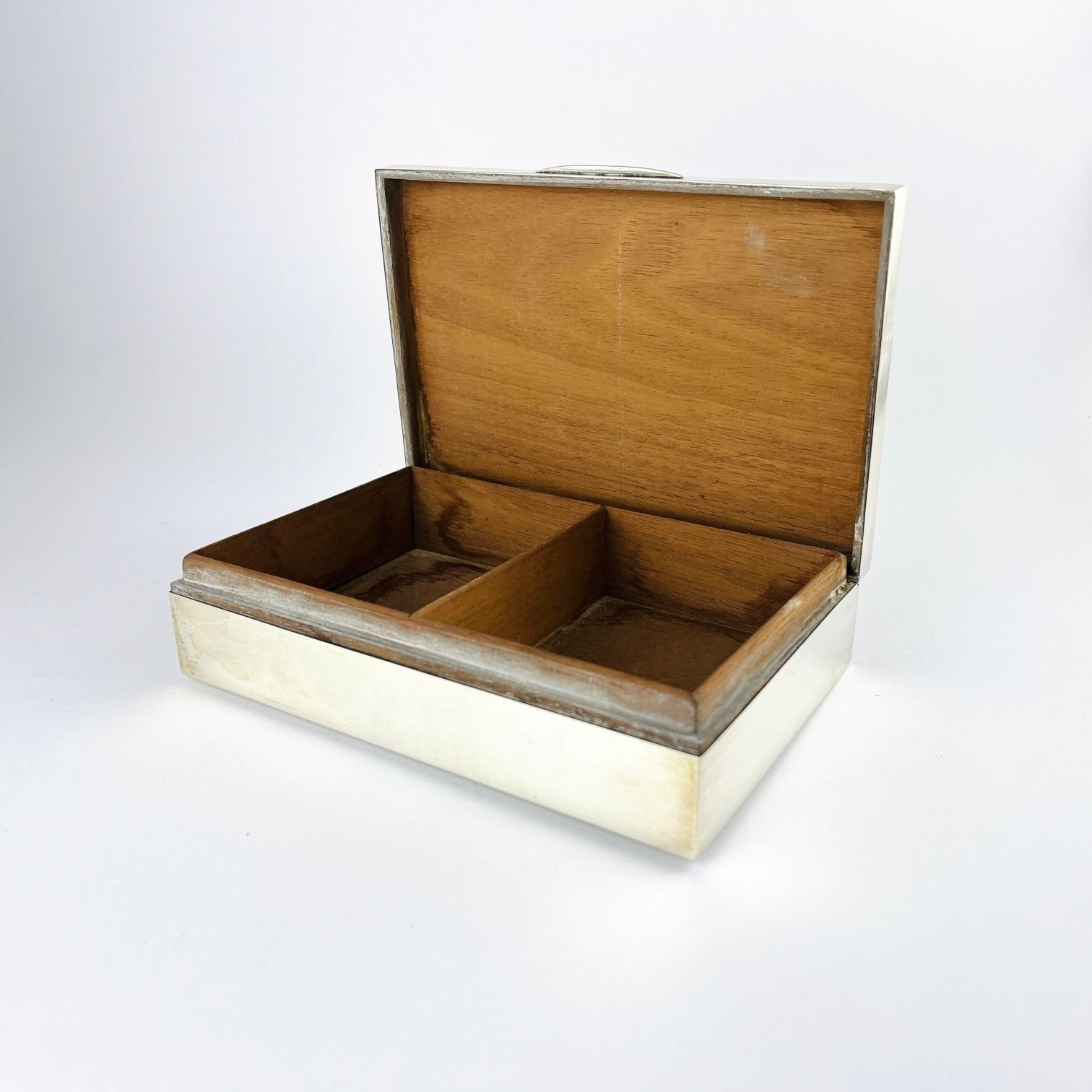 Cigarrera inglesa rectangular de sobremesa en plata de Birmingham año 1946, segrinada. 4.5 x 17 x 11 cm. Presenta pequeña avería.