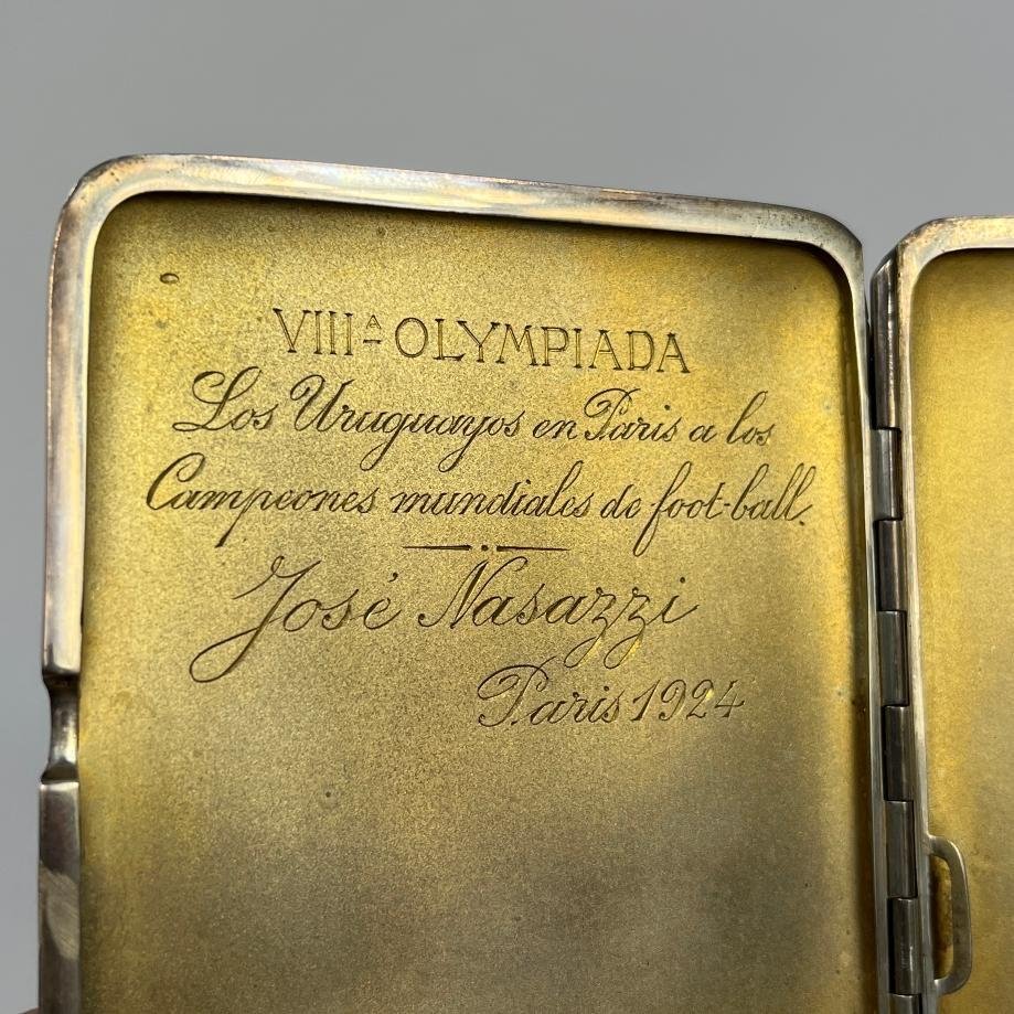 Cigarrera francesa de bolsillo en plata y oro otorgada al jugador de la Selección Uruguaya José Nasazzi durante la cena celebrada en el Palais d’Orsay por los uruguayos en París con motivo de la victoria en las Juegos Olímpicos de 1924. Tapa segrinada e interior vermeil, con interior de tapa frontal grabada con inscripción “VIIIa Olympiada. Los uruguayos en París a los campeones mundiales de Foot-Ball. José Nasazzi. París 1924”. 9 x 7,5 cm.
